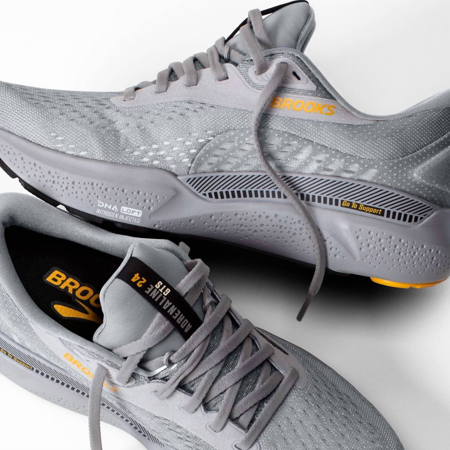 The BROOKS Men's Adrenaline GTS 24 Running Sneakers in Alloy/White/Gold Fusion are designed for a rainy run, thanks to the GORE-TEX® Invisible Fit technology. Crafted from recycled material, these sneakers offer updated dynamic cushioning for a soft, balanced feel underfoot, weighing just 10.0 oz (283.5g) with a 12mm midsole drop. Perfect for road running and walking, they feature the trusted GuideRails® support system, a breathable mesh upper, and a secure fit for smooth transitions. Embrace athleisure in these sneakers ideal for fitness workouts, whether it’s spring training or celebrating the 4th of July.