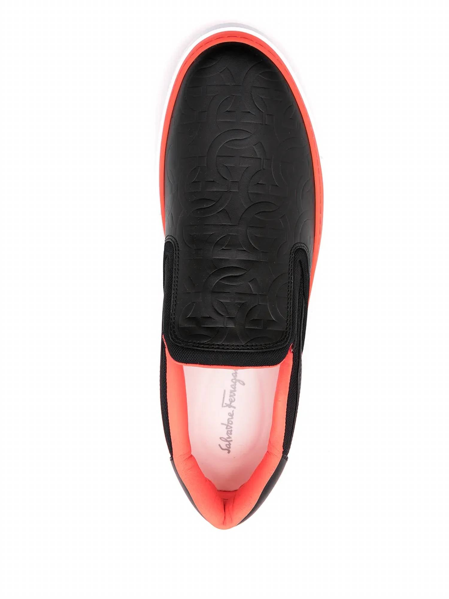 Introducing the Men's Gancini Slip-on Sneaker by Salvatore Ferragamo, a minimalist travel essential. These sneakers boast a slip-on design with a black and orange color scheme, crafted from 78% calf leather, 19% polyamide, and 3% elastane. Made in Italy, they feature elasticated side panels, a round toe, and a chunky rubber lug sole for both style and comfort. Complete with a branded insole, these shoes offer a flat heel height of under 1 inch and are perfectly suited for Spring and New Year's Eve occasions.