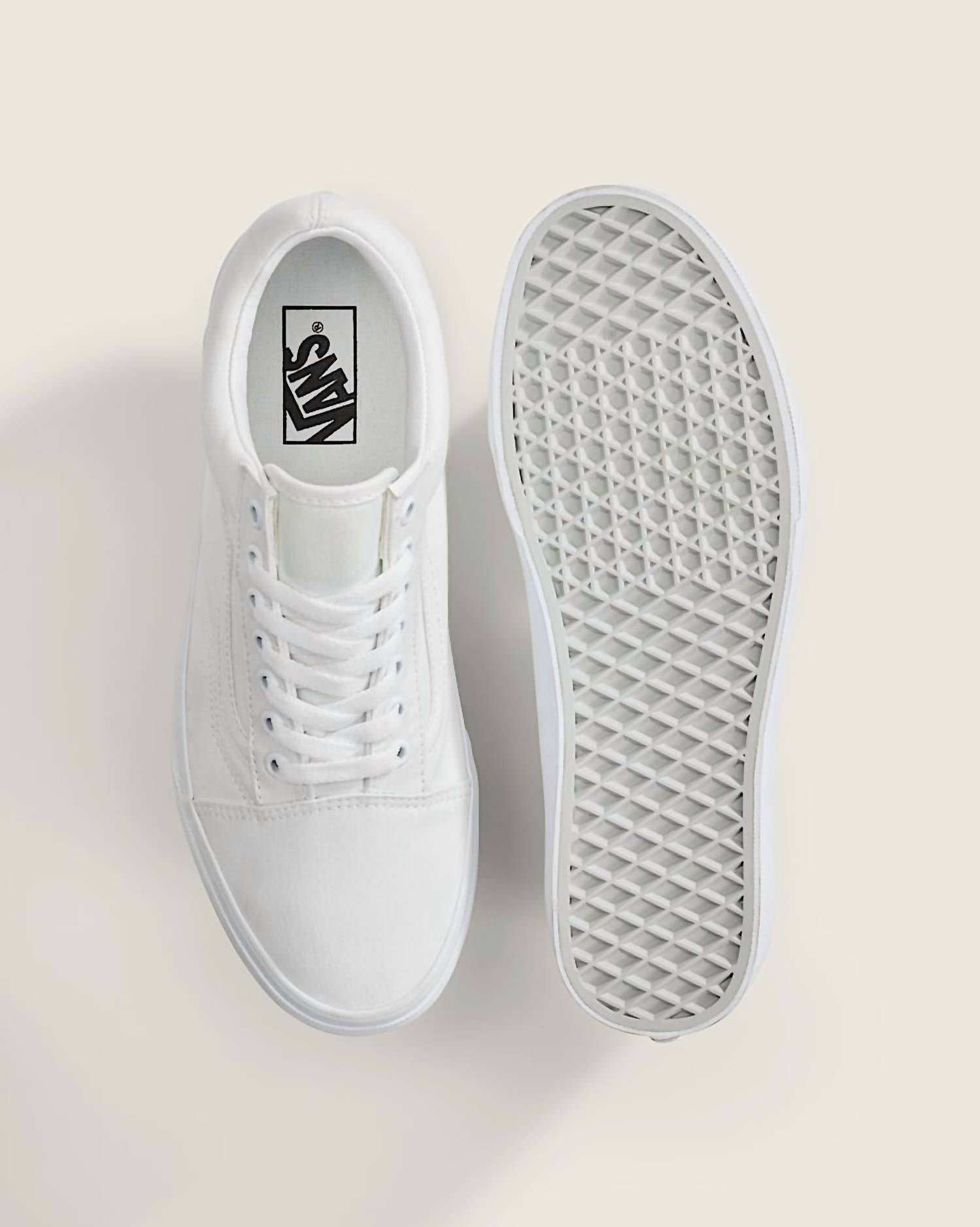 Discover the Unisex Old Skool Shoes by Vans in a crisp True White, merging timeless style with durability. These low-top sneakers feature canvas and synthetic uppers, complemented by a padded collar for added support and comfort. Ensuring a secure fit, the lace-up closure pairs with a rubber sidewall adorned with the iconic foxing stripe and signature waffle outsole pattern, offering reliable grip since 1966. Embrace the original vulcanized build and iconic Sidestripe™ design, perfect for a classic, versatile look.