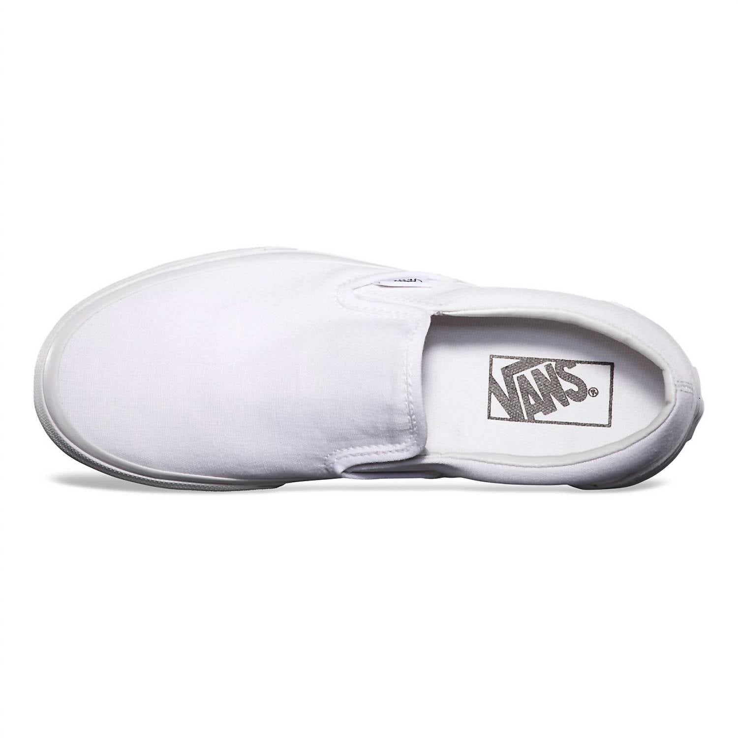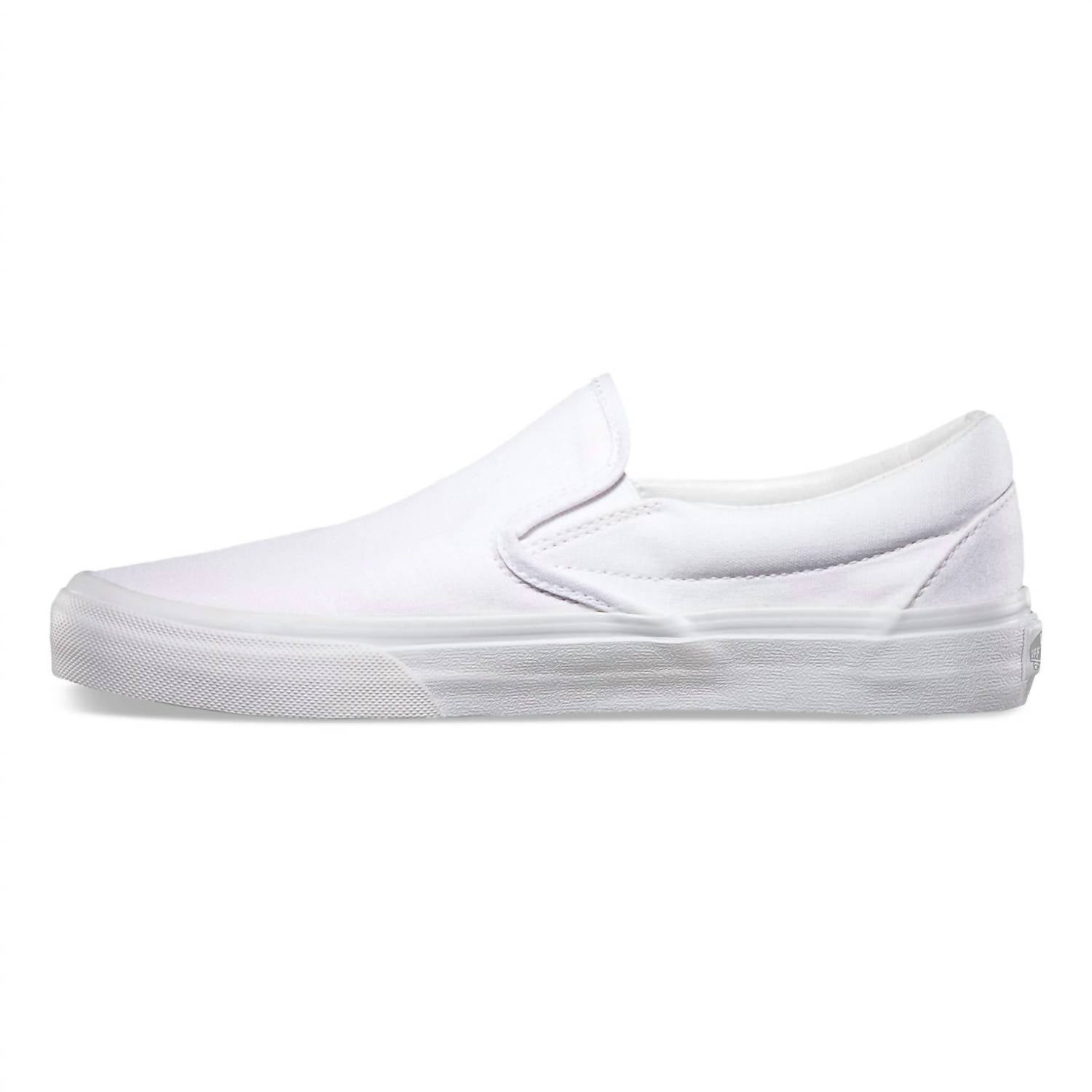 Step into timeless style with the Unisex Classic Slip-on Sneakers by Vans, in a crisp True White canvas. These iconic shoes feature a padded collar and elastic side panels, ensuring both support and easy wearability. Enjoy the signature vulcanized build, rubber sidewall with classic foxing stripe, and the reliable grip of the waffle outsole pattern, a hallmark since '66. Perfectly rounded at the toe, these sneakers are an essential addition to any adult wardrobe.