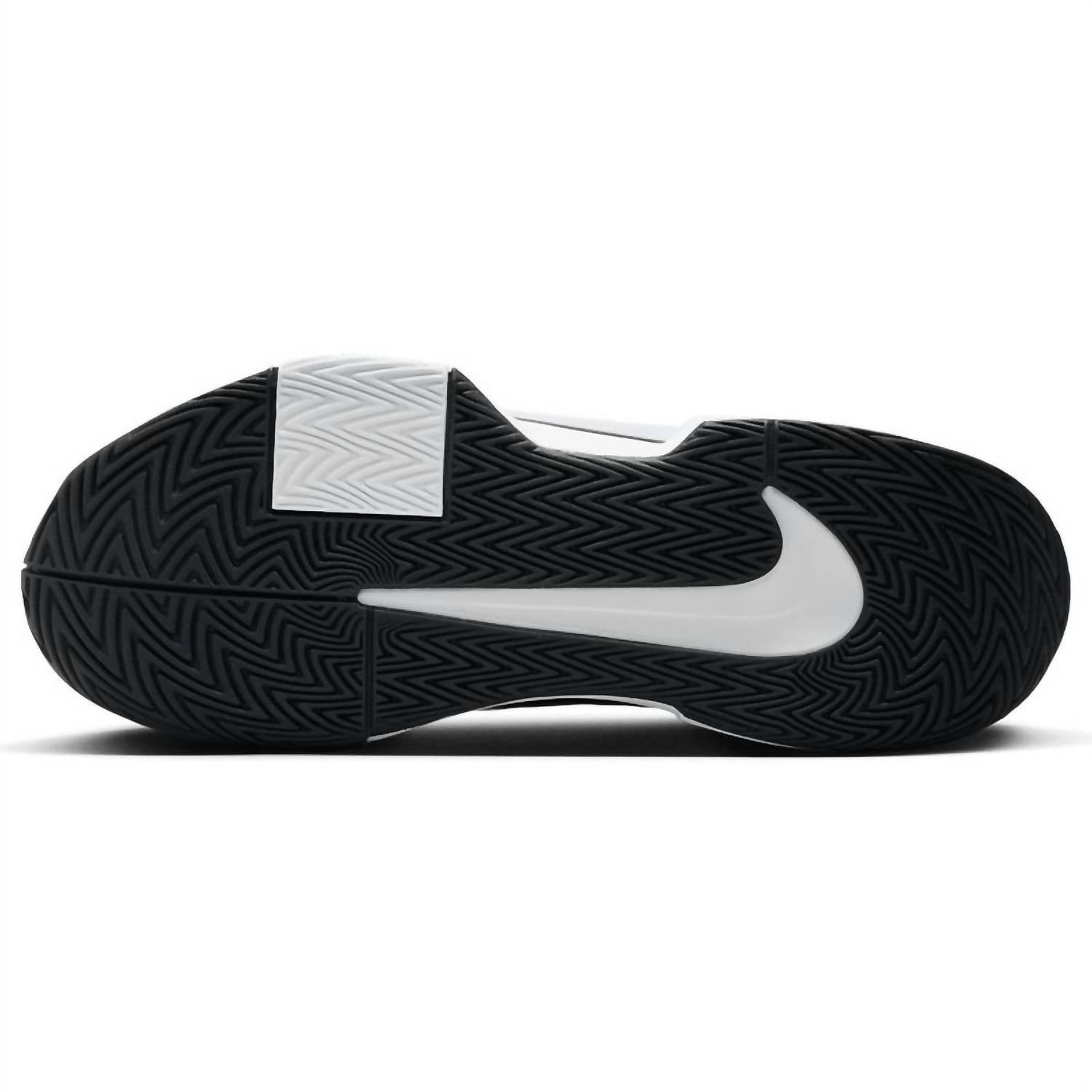 Meet the Men's Zoom Gp Challenge Pro Hard Court Tennis Shoes by Nike, crafted for effortless agility and speed on the court. In a classic Black/White colorway, these shoes feature a robust midfoot plastic plate for stability and a padded tongue with breathable mesh to keep you cool. The wide base enhances stability, with extra rubber in the toe area ensuring durability, while high abrasion rubber in the forefoot provides exceptional traction. Designed for the modern athlete, they boast a round toe and platform heel, perfect for Game Day or any athleisure occasion.