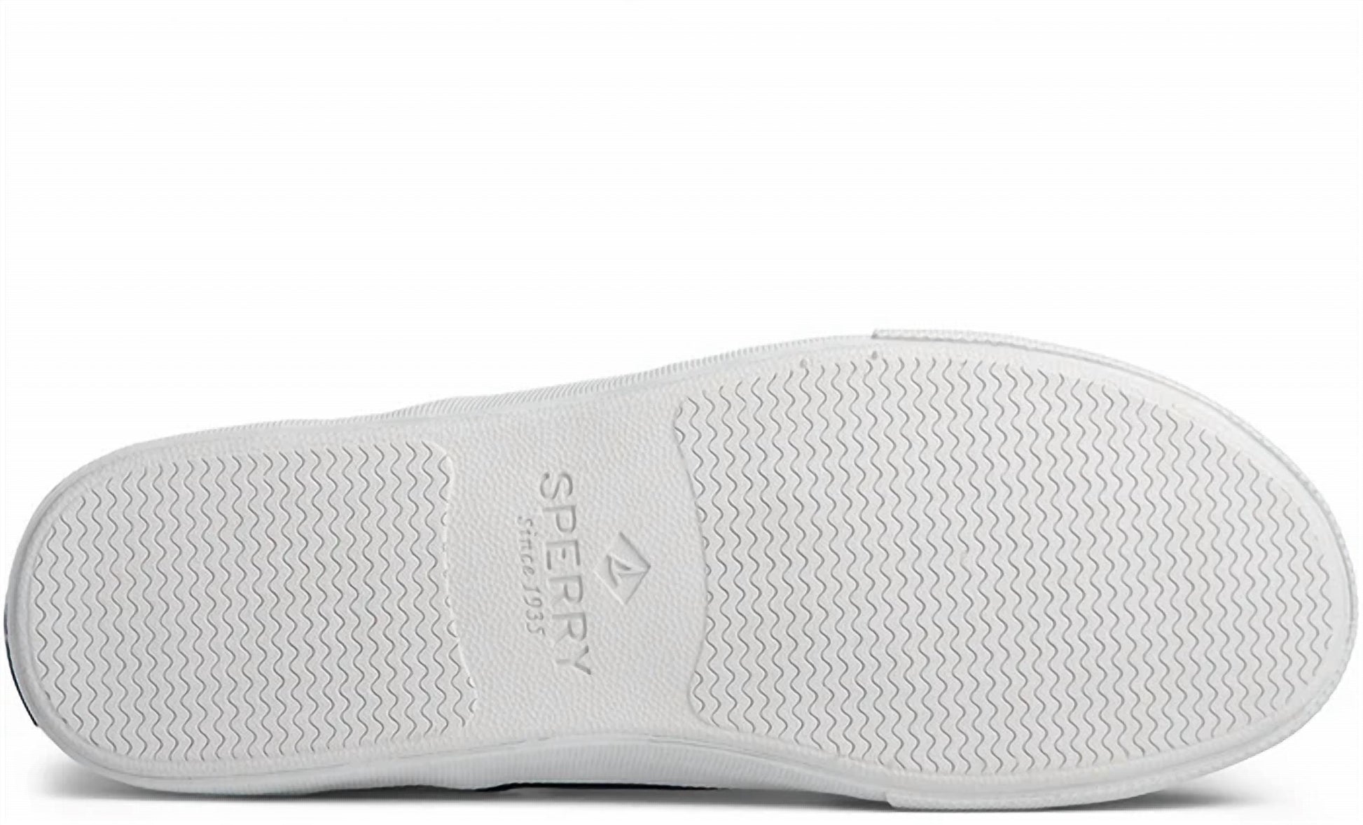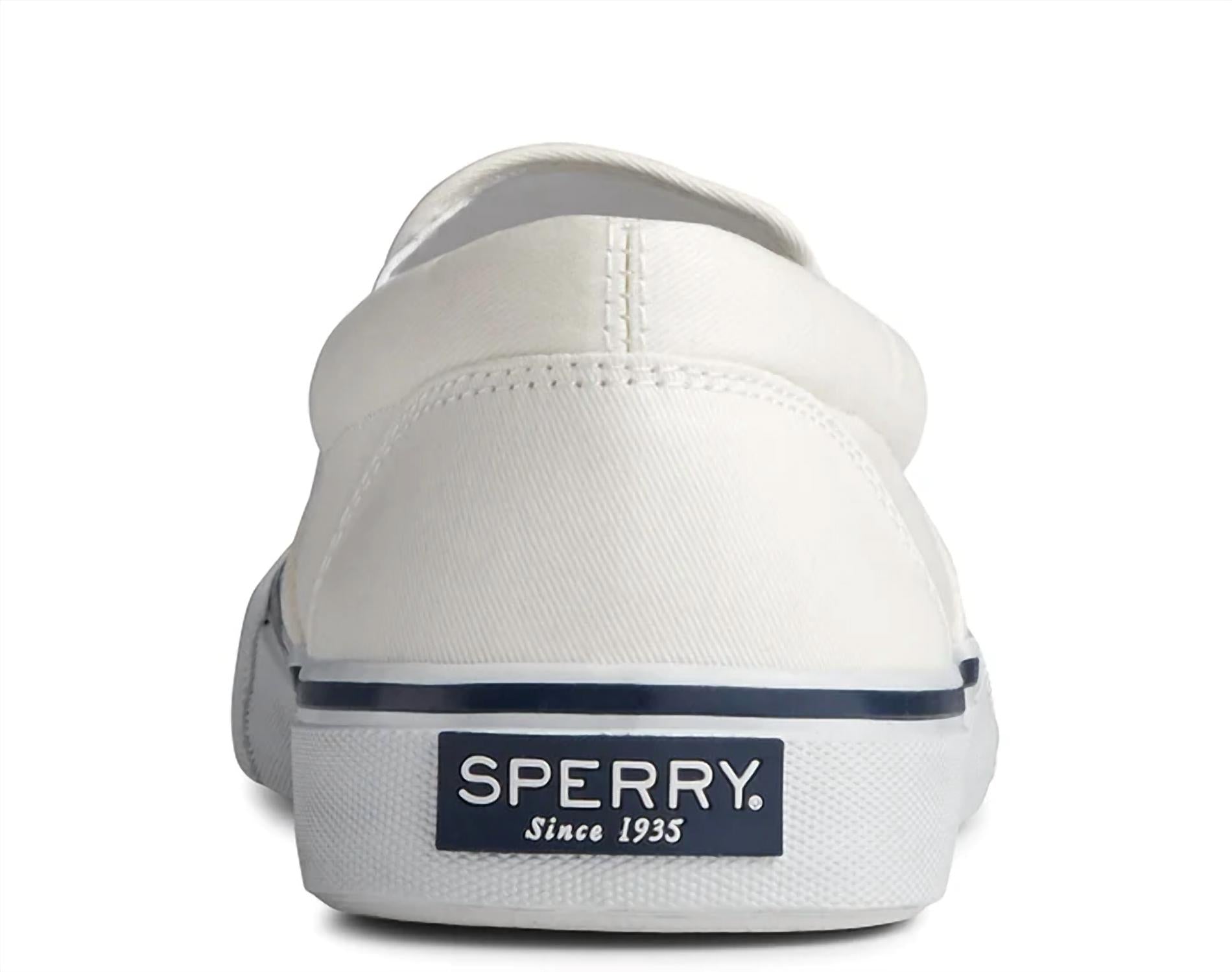 Upgrade your footwear collection with the Men Striper II Slip On Sneakers by Sperry, designed for both style and convenience. Featuring a relaxed salt-washed twill upper in a crisp white, these sneakers boast a twin gore construction for effortless on and off wear. Enjoy enhanced traction in all conditions with the non-marking rubber outsole featuring Sperry's signature molded Wave-Sipingâ„¢ technology. These sneakers combine minimalist design with practical functionality, making them a versatile addition to any wardrobe.