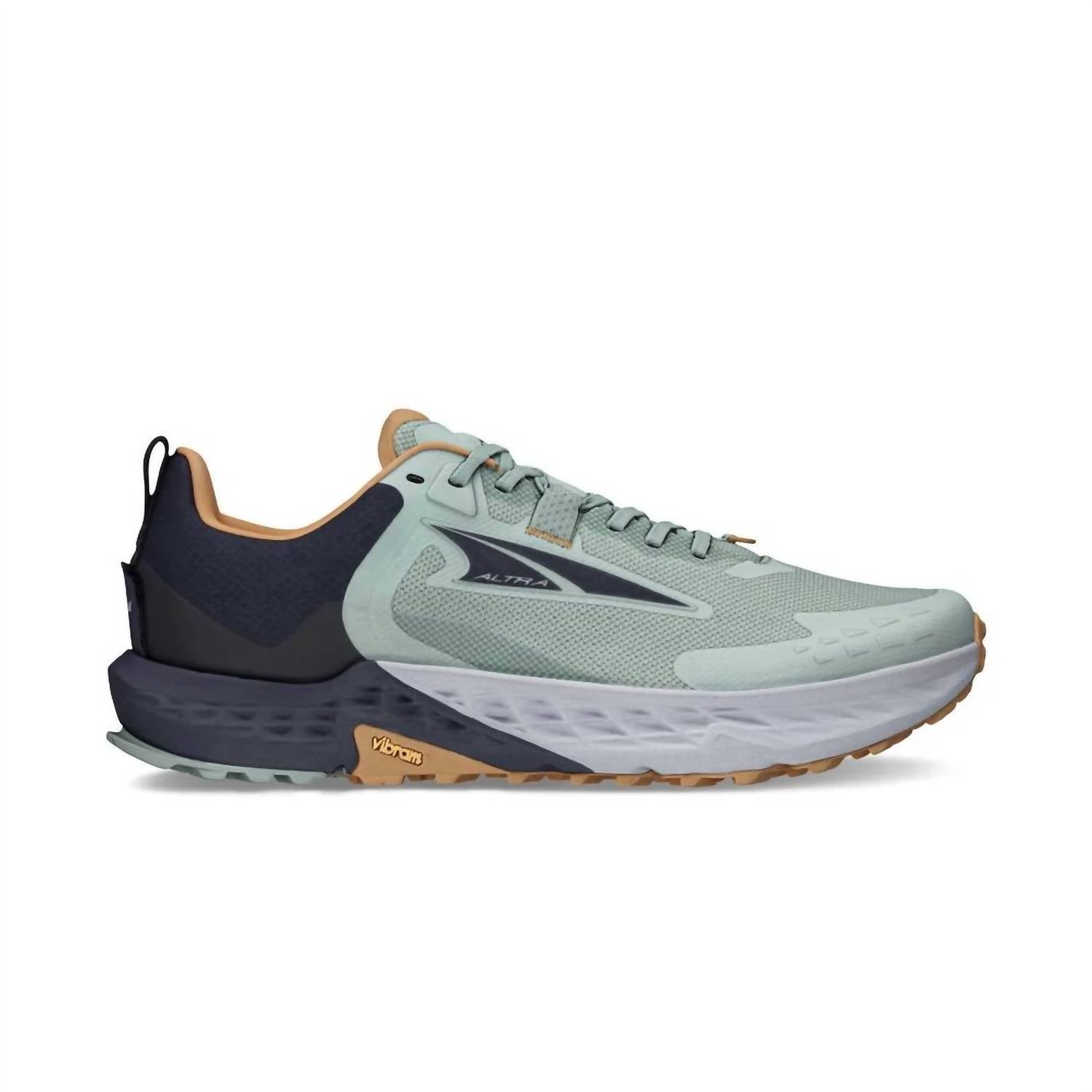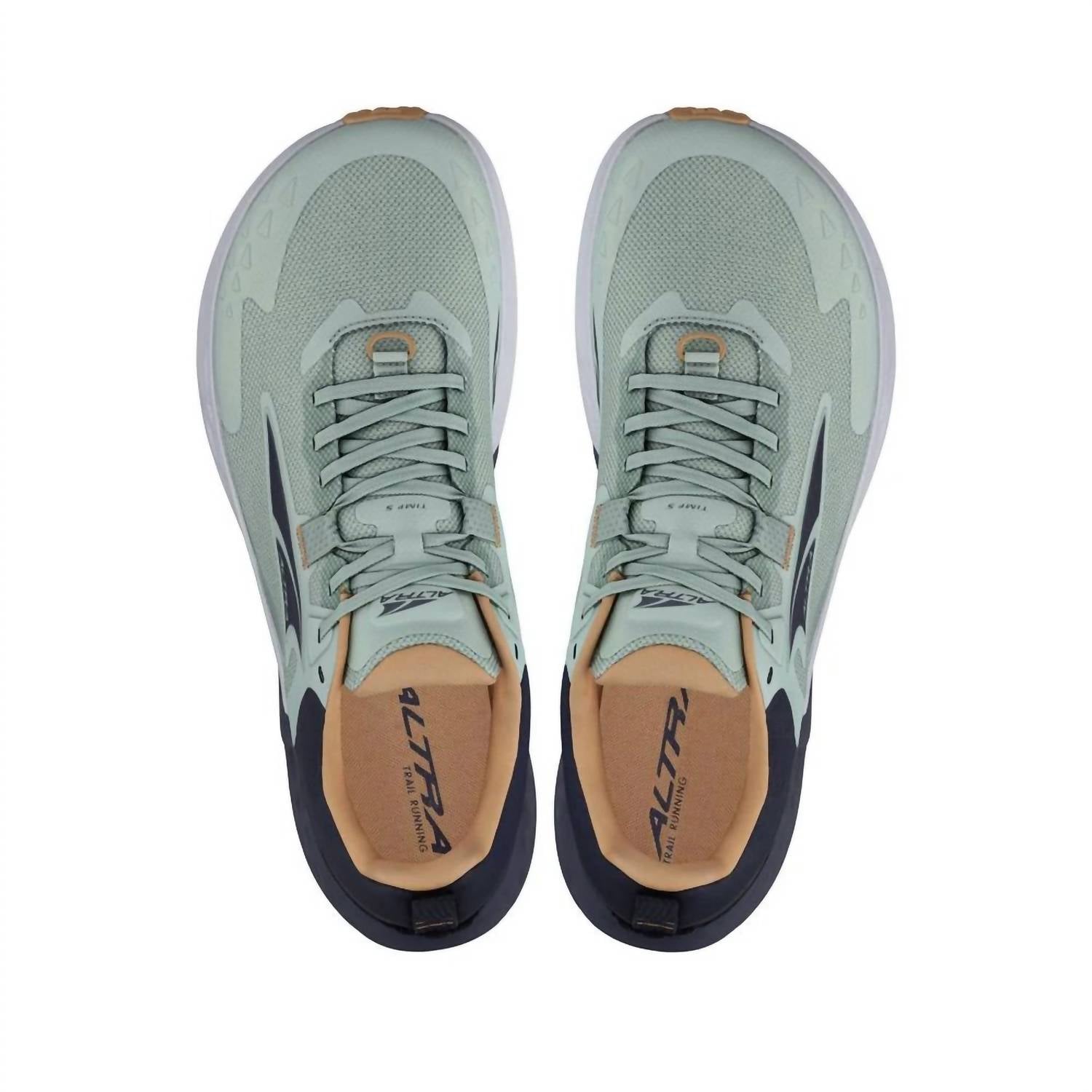 Discover the Men's Timp 5 Shoes by ALTRA, a trail running essential in a sleek green and gray colorway. Designed for hiking and athleisure activities, these shoes feature a 0mm heel-to-toe drop with a flat heel style to enhance your natural stride. The Vibram® Megagrip outsole ensures exceptional traction on various surfaces, complemented by the updated Altra EGO™ MAX midsole for superior comfort and resilience. With a spacious round toe box and an upper made of quick-dry air mesh, experience freedom and agility on every summer adventure.