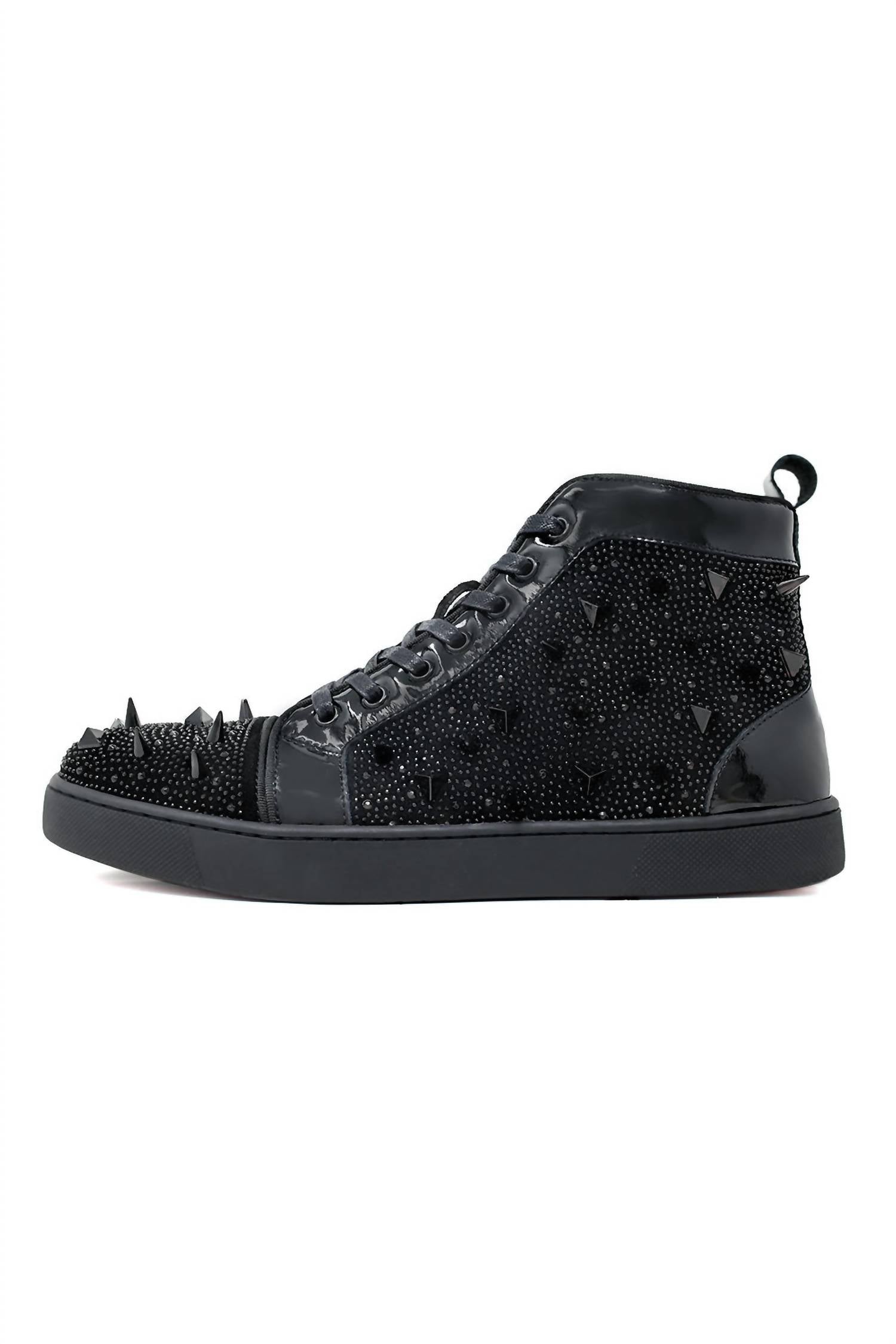 Step up your style game with BARABAS Men's Shin Splints High Top Sneakers. These ankle sneakers feature a unique rhinestone and spike diamond upper, complemented by a shiny black leather accent and black lining. Crafted with a 100% genuine leather upper and a man-made sole, they offer both luxury and durability. Designed as round-toe lace-up sneakers, they are perfect for any occasion, including birthdays, and should be spot cleaned to maintain their pristine appearance.