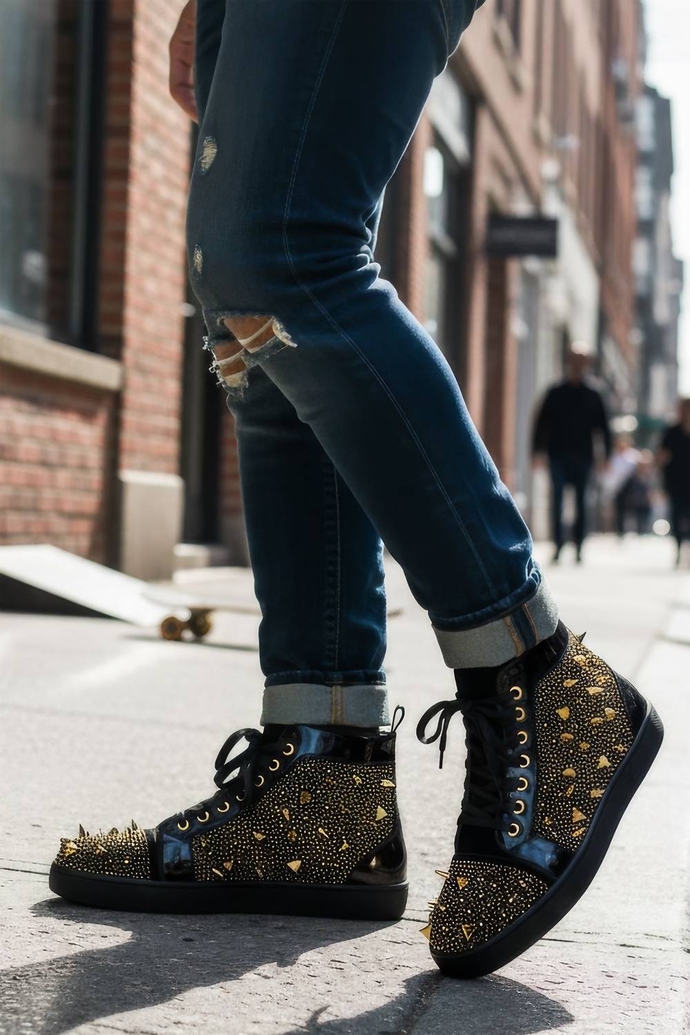 Step up your style game with BARABAS Men's Shin Splints High Top Sneakers in striking Black Gold. These ankle sneakers feature a unique rhinestone and spike diamond upper, complemented by a shiny black leather accent and black lining. Crafted with a 100% genuine leather upper and a man-made sole, they offer both luxury and durability. Designed as round-toe lace-up sneakers, they are perfect for any occasion, including birthdays, and should be spot cleaned to maintain their pristine appearance.