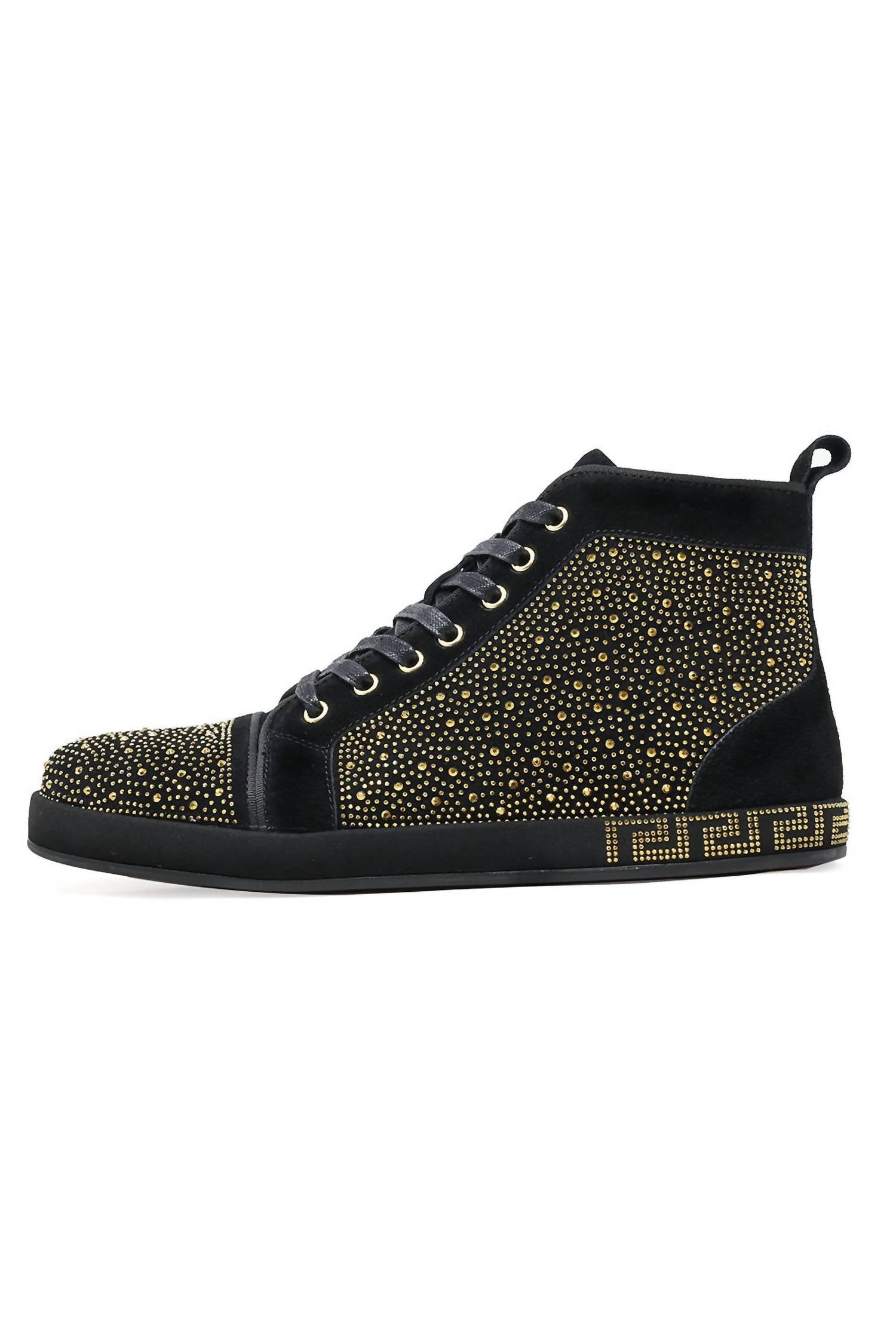 Elevate your style with the Men's Show Stopper High Top Sneakers by BARABAS, featuring a luxurious Greek key pattern and dazzling rhinestone diamond detailing. These multi-colored high-top sneakers offer a round toe and a comfortable flat heel, perfect for any occasion, even camping. Made with a leather lining and a black man-made sole, they ensure durability and comfort. Lace-up. Spot clean to maintain their pristine appearance.