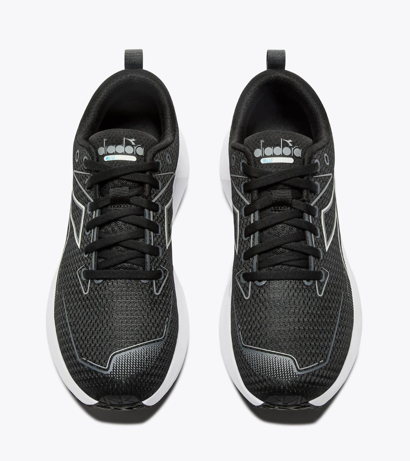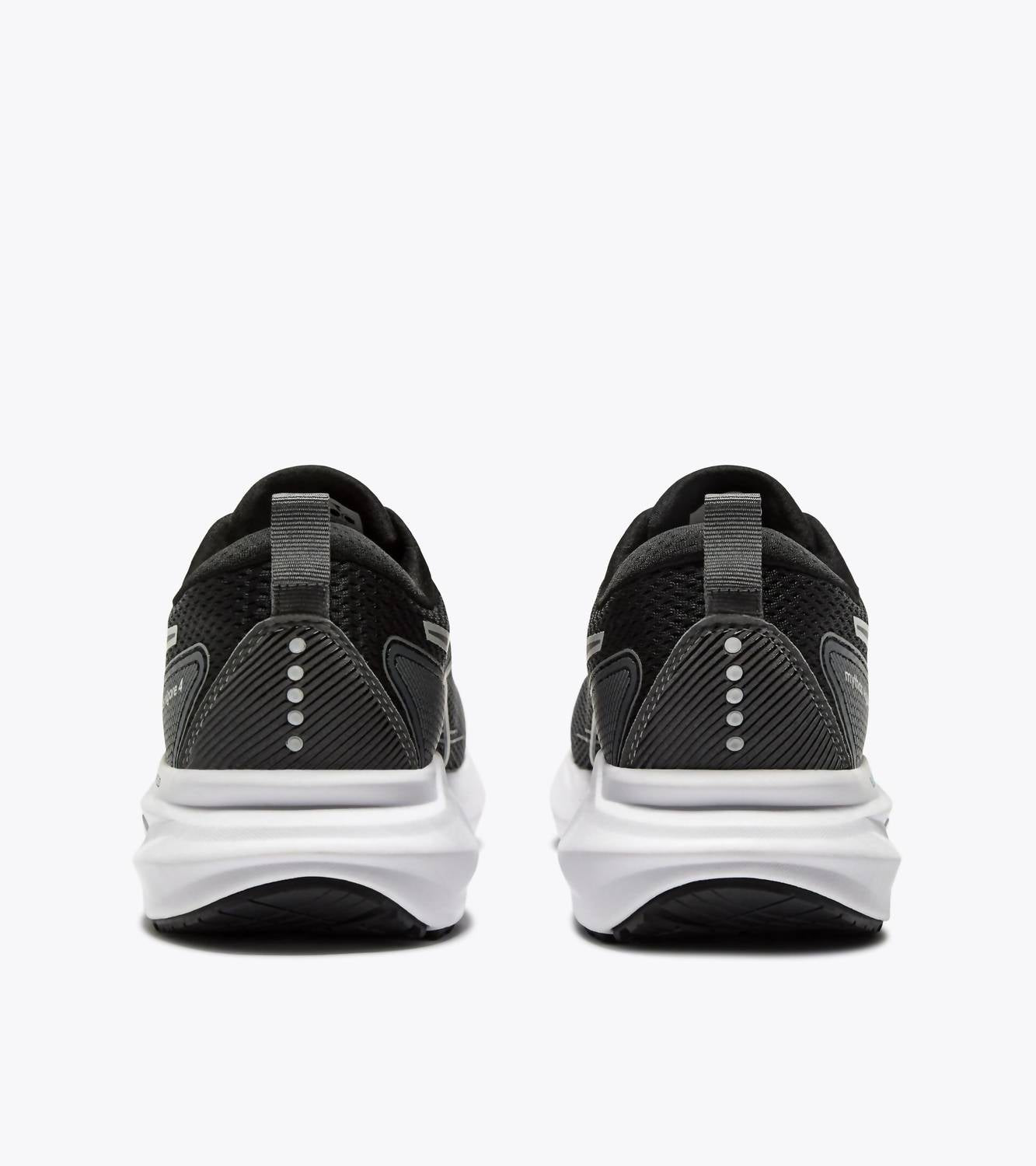 Introducing the Men's Mythos Blushield Vigore 4 Running Shoes by Diadora in Black/Steel Gray, designed for optimal performance and comfort. These shoes feature a redesigned mesh upper with an integrated tongue, engineered with breathable air mesh nylon and microfiber for a secure yet comfortable fit. Weighing 340 grams (size 9 UK) and featuring an 11 mm drop, the Vigore 4 incorporates Blushield and TRX technologies, effectively reducing overpronation and providing a balanced running experience. Closure: Lace-up. Suitable for a range of surfaces, it's the ideal athletic shoe for those prioritizing stability, cushioning, and control during summer fitness or workout sessions.
