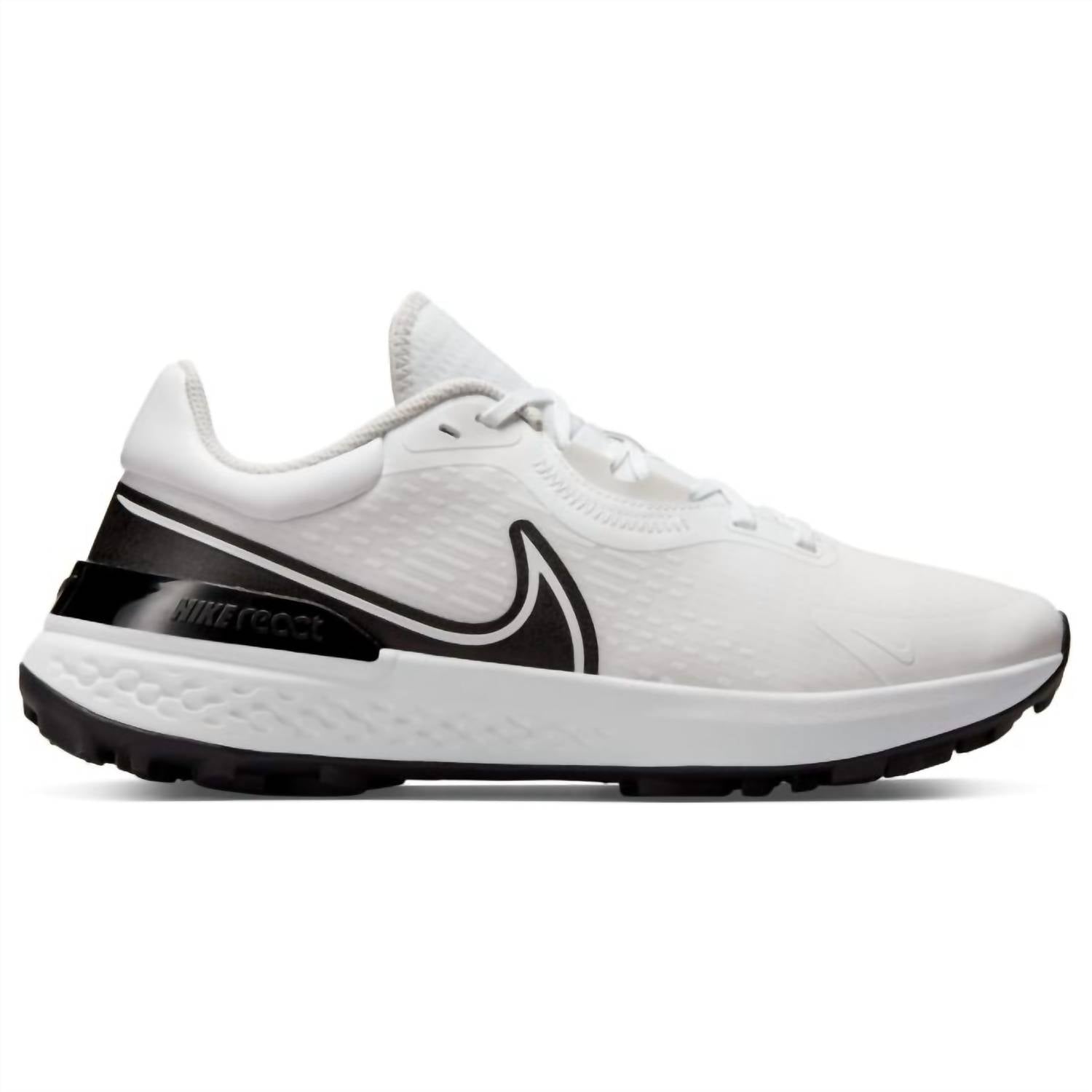 Introducing the Men's Infinity Pro Two Spikeless Golf Shoes by NIKE, crafted specifically for athletic performance and style. These shoes come in a sleek White Black color scheme and feature a round toe and chunky, low heel measuring between 1 1/4" and 2", perfect for fitness and workout sessions. Designed for athleisure enthusiasts, they are ideal for the spring season. Enjoy superior comfort and grip on the golf course with these standout shoes.