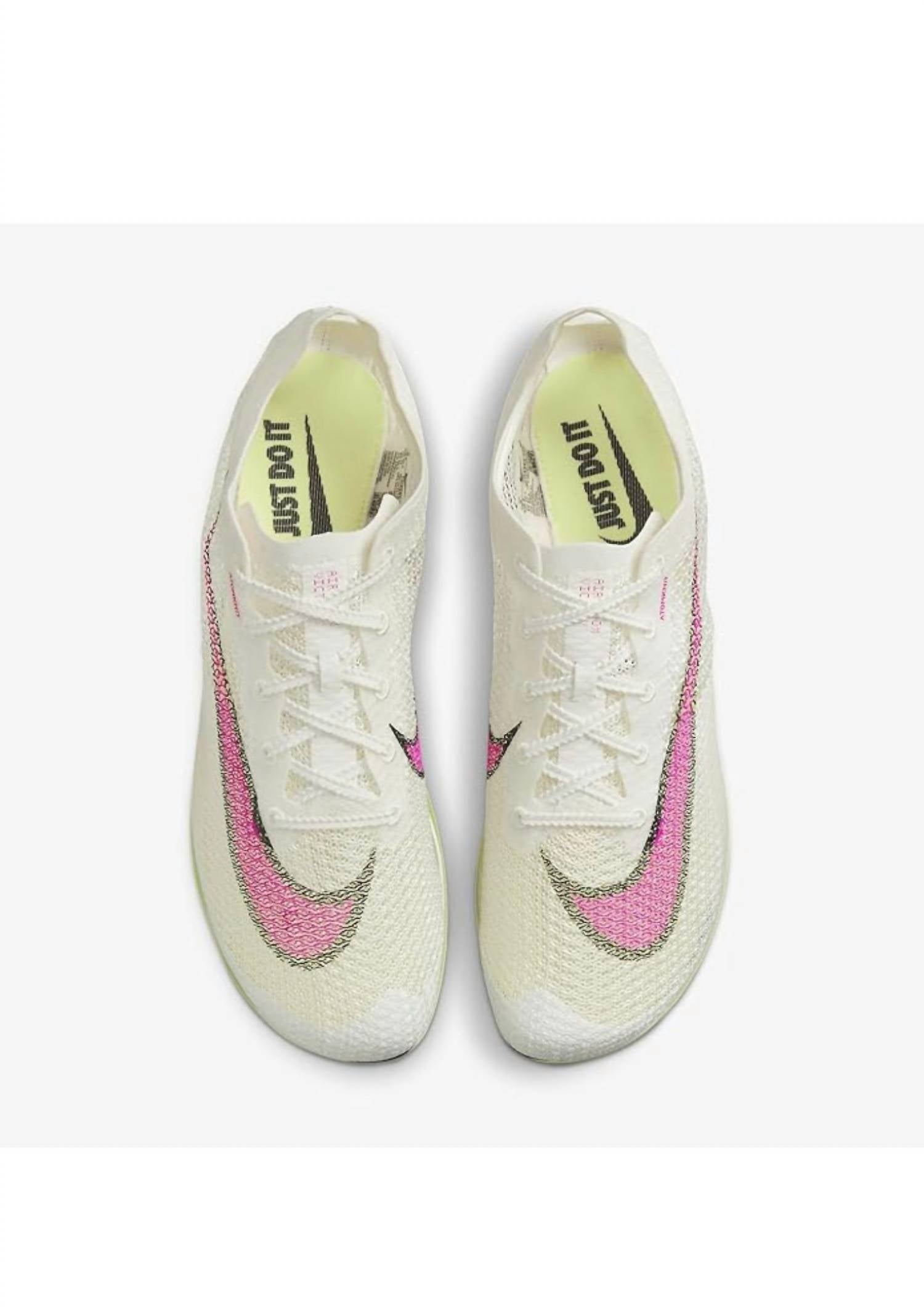Elevate your track performance with the Unisex Air Zoom Victory Track & Field Shoes by Nike, designed for distances from 800 to 5,000 meters. Featuring innovative AtomKnit fabric, these spikes offer lightweight support with enhanced breathability and a form-fitting comfort. They boast responsive Nike ZoomX foam and a Zoom Air unit in the heel for exceptional energy return and shock absorption. Closure: Laces with cutouts. Color: Sail/Fierce Pink-Lt Lemon Twist. Stride confidently with a traction pattern designed with insights from hundreds of runners, approved by World Athletics for serious competition.