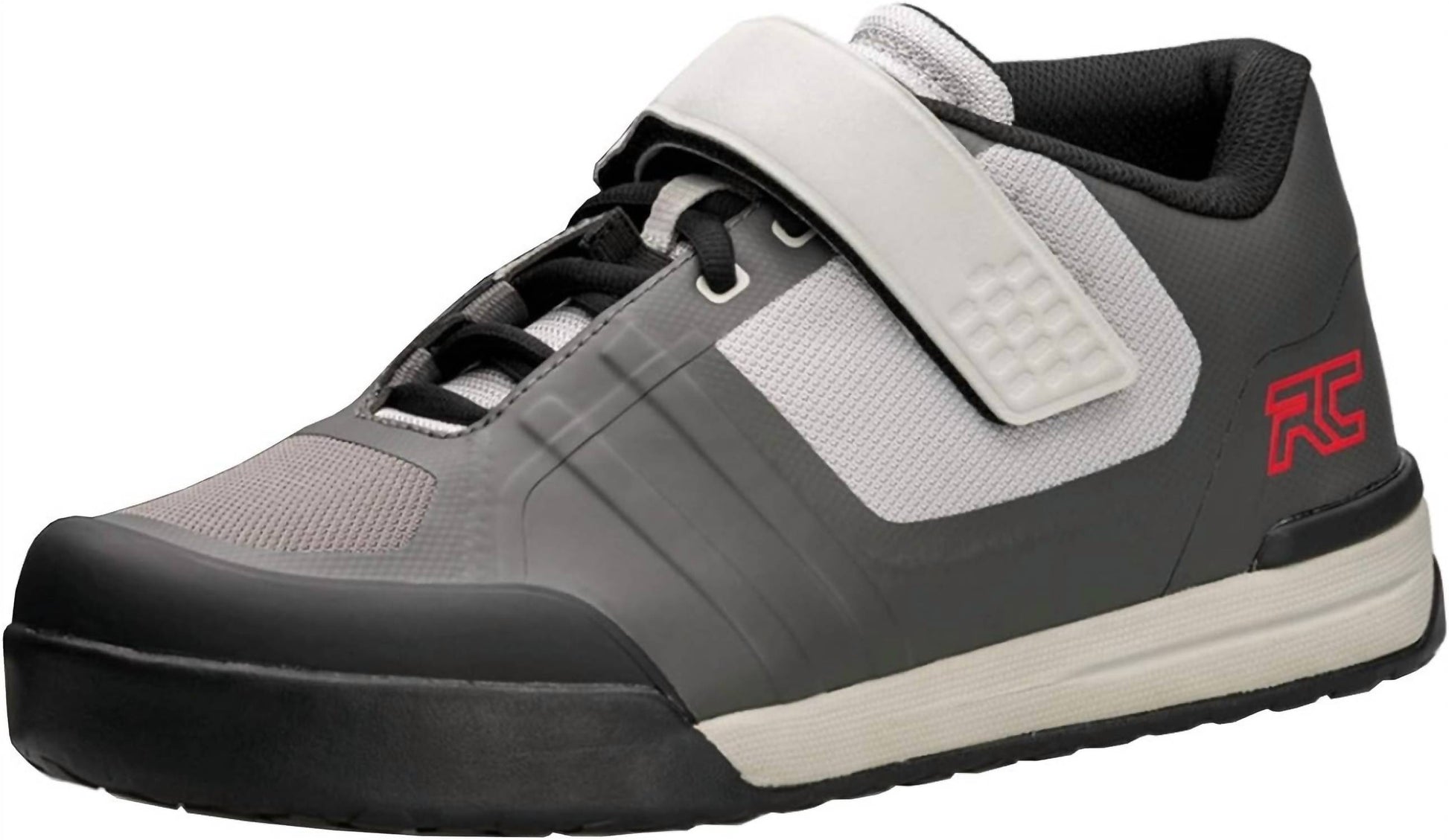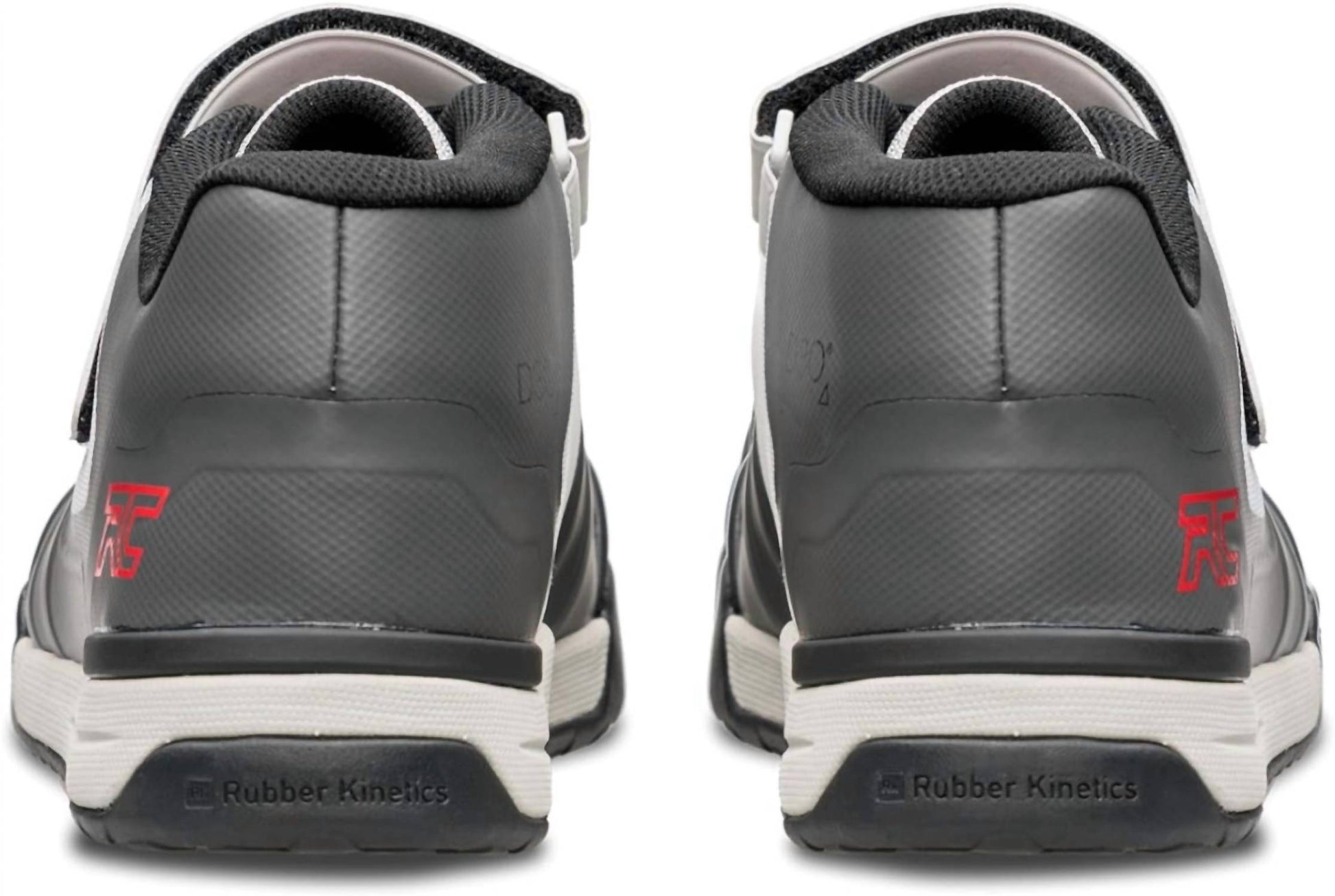 Introducing the Men's Transition 2021 Mountain Bike Shoe by Ride Concepts, designed for optimal pedal engagement with a 40mm wide cleat box. The shoe features a welded microfiber upper that is both weather resistant and breathable, offering protection with a custom-molded toecap and heel. Its RC PowerDrive nylon shank ensures power transfer, while the asymmetrical medial collar is equipped with D3O impact protection. The Rubber Kinetics DST 8.0 MID GRIP rubber outsole provides added stiffness and off-bike grip.