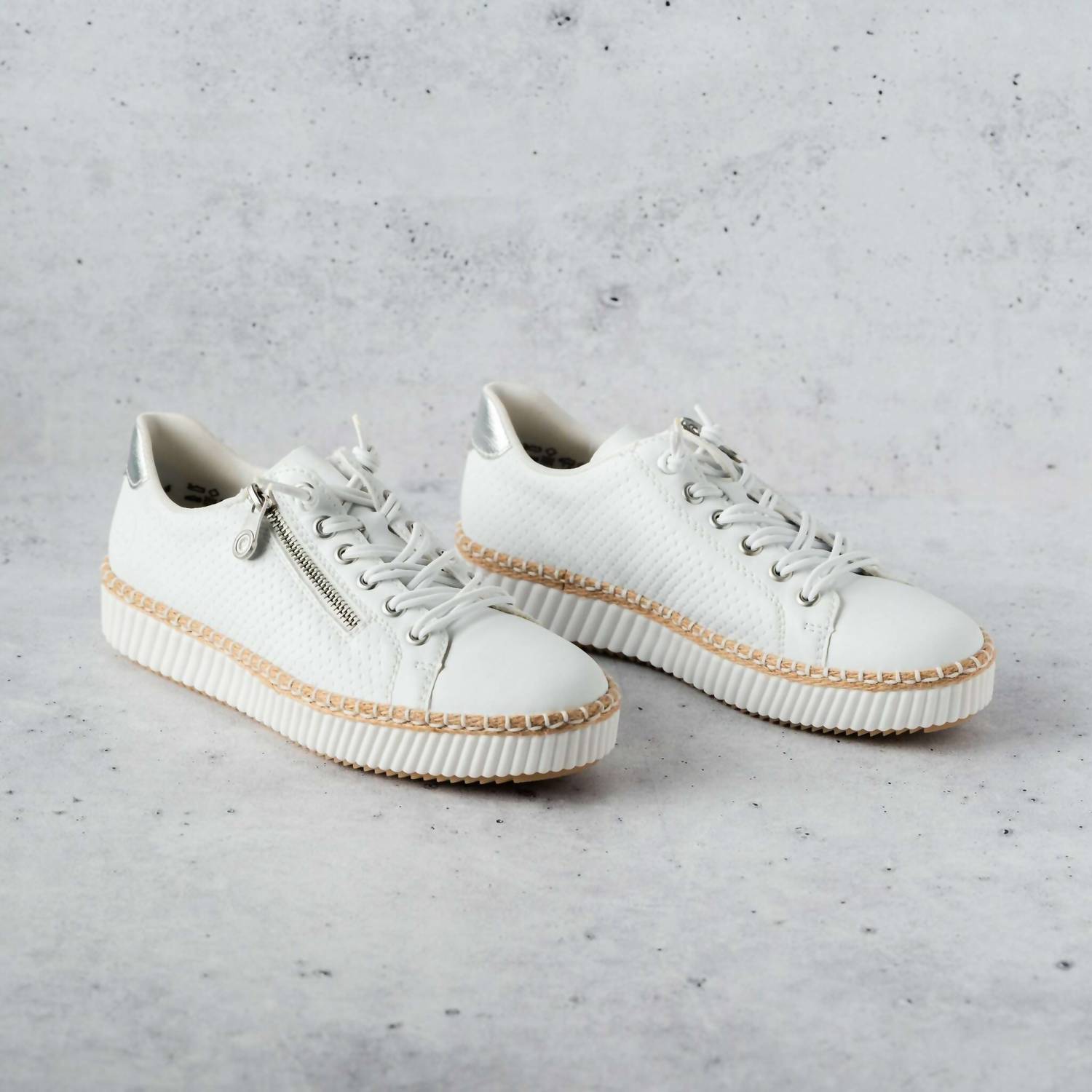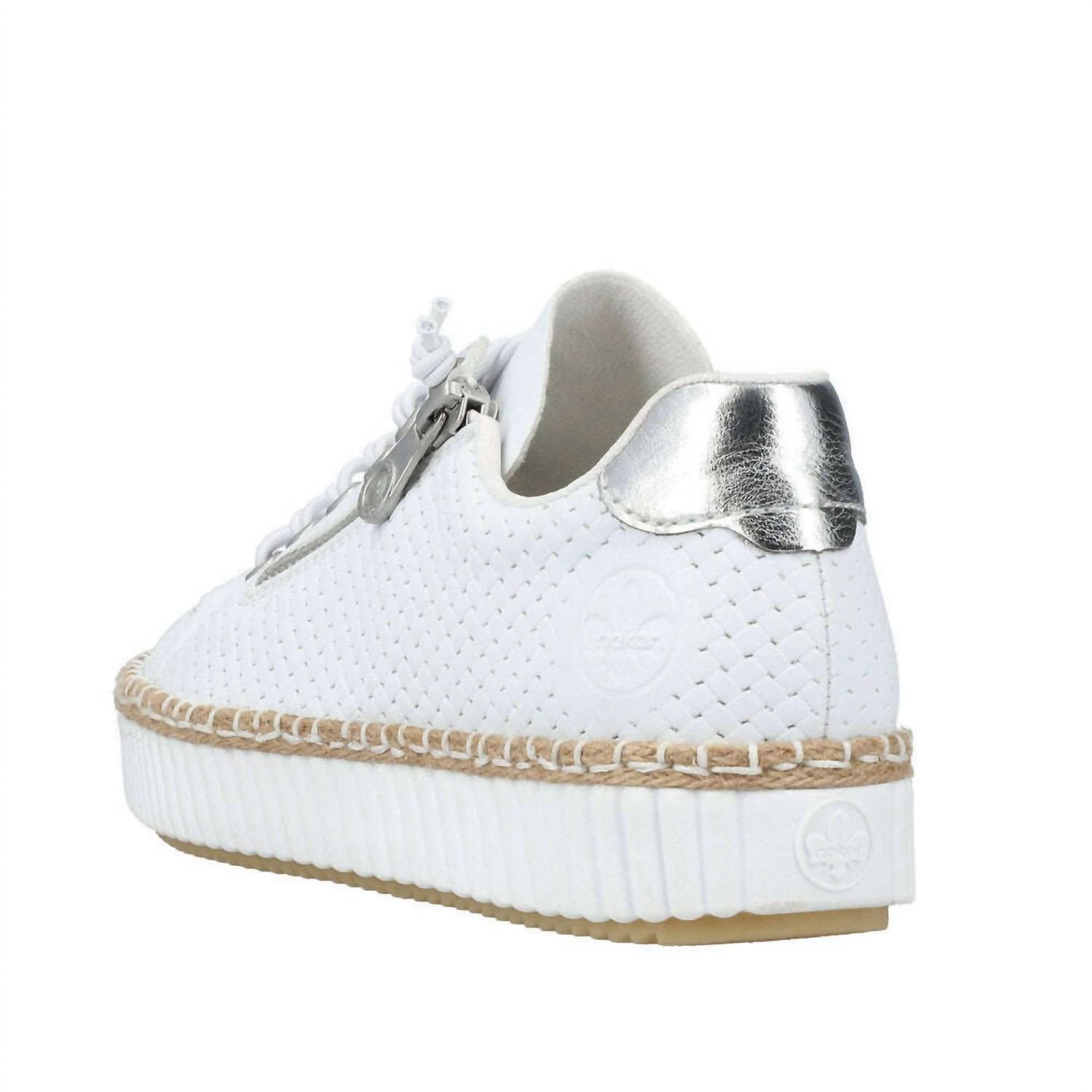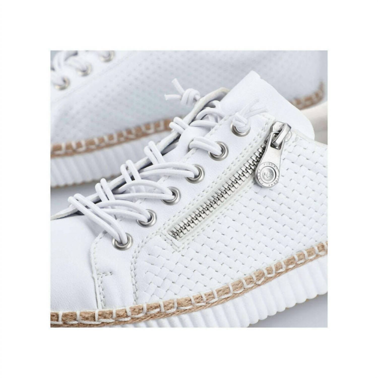 Elevate your casual footwear collection with the Men's Padded Sneakers by RIEKER, crafted in sleek white woven leather. Featuring a unique design, these sneakers offer a zipper and bungee lacing closure for easy on-and-off convenience. The round toe and flat heel make them perfect for travel, while the removable padded insole ensures comfort all day. Ideal for the summer season, these minimalist sneakers are a stylish blend of fashion and function.