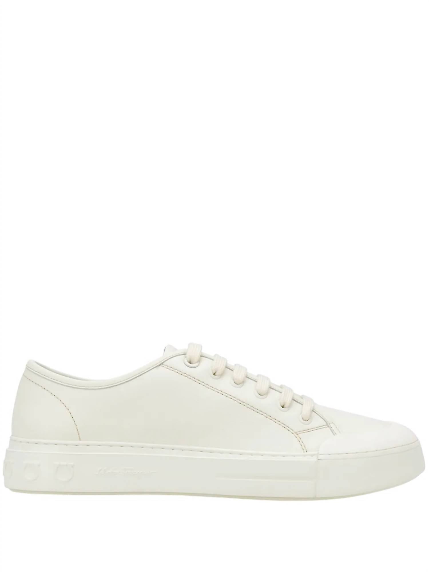 Step into casual sophistication with the Men's Gancio Low Top Sneakers by Salvatore Ferragamo. Crafted in Italy, these sleek sneakers feature a white leather upper, a flat rubber sole marked with the distinctive embossed Gancio motif, and a round toe. Designed for comfort and style, the shoe includes a lace-up front fastening and a branded insole, with a composition of 100% calf leather outer, 100% suede lining, and 100% rubber sole. These sneakers have a medium fit (M) and a heel height of 1.57 inches, perfect for minimalist travel or a stylish New Year's Eve ensemble.