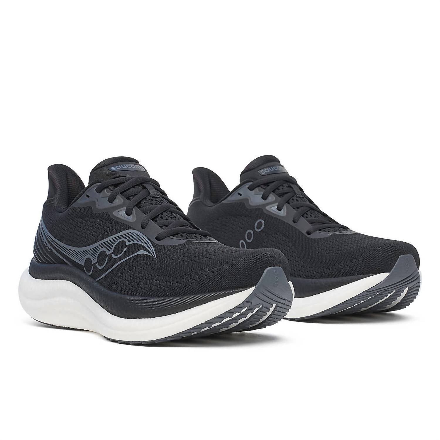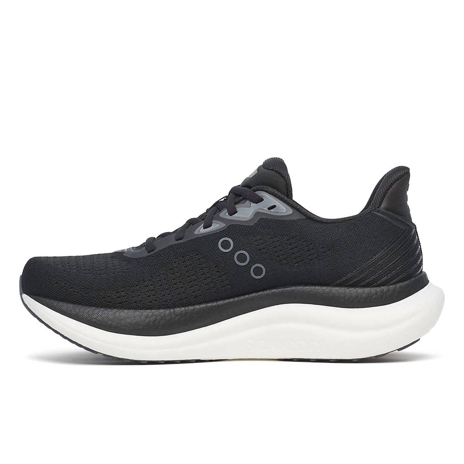 Experience unmatched comfort and performance with the Men's Triumph 23 Running Shoes from Saucony, perfect for fitness enthusiasts seeking longer runs. In stylish black and white, these sneakers feature a round toe and are designed to excel in athleisure trends, particularly in the summer season. The PWRRUN PB midsole has been enhanced for a softer, lighter feel complemented by a premium, super-responsive sockliner and updated outsole for smooth transitions. Ideal for fitness and workout occasions, these men’s sneakers stretch your comfort zone with every mile.