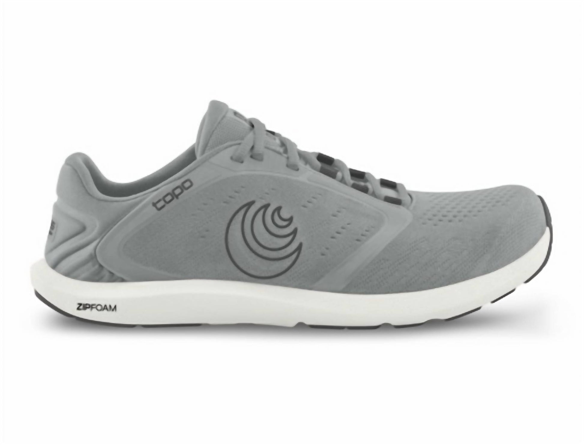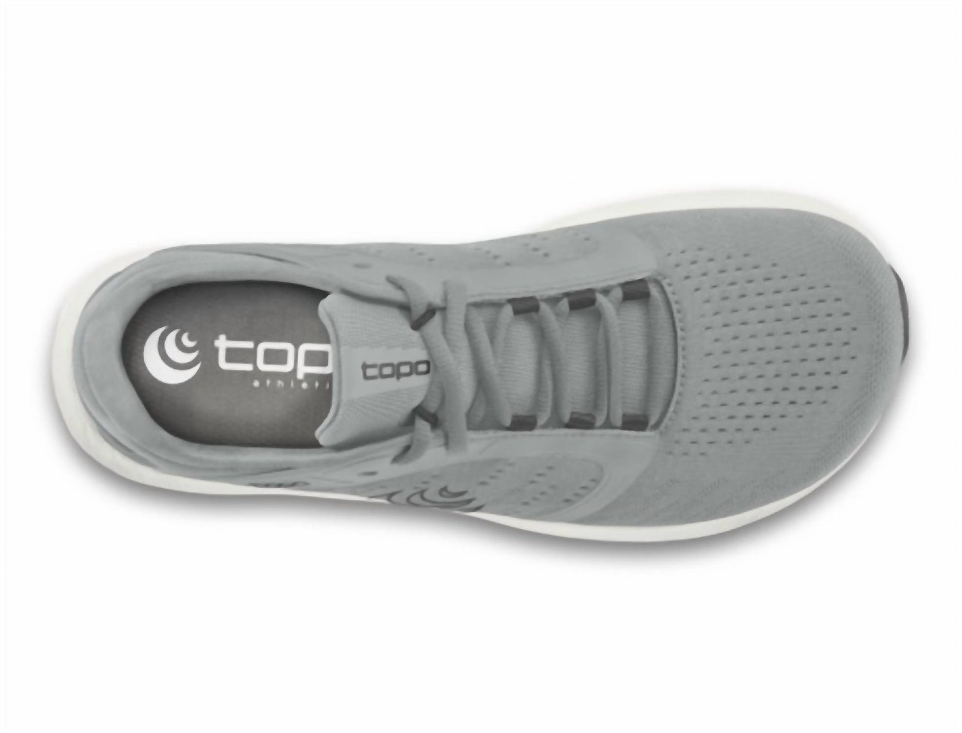 Introducing the Men's ST-5 Road Running Shoe by Topo Athletic, designed for natural running enthusiasts and gym-goers. This sleek shoe in Grey/White features a recycled mesh upper, offering a secure and well-ventilated fit. The newly refreshed design includes a ZipFoam™ midsole and a zero drop platform, lowered to just 14 mm for a close-to-barefoot experience while maintaining comfort. Perfect for fitness, gym work, or casual summer wear, these shoes are an athleisure trend staple.