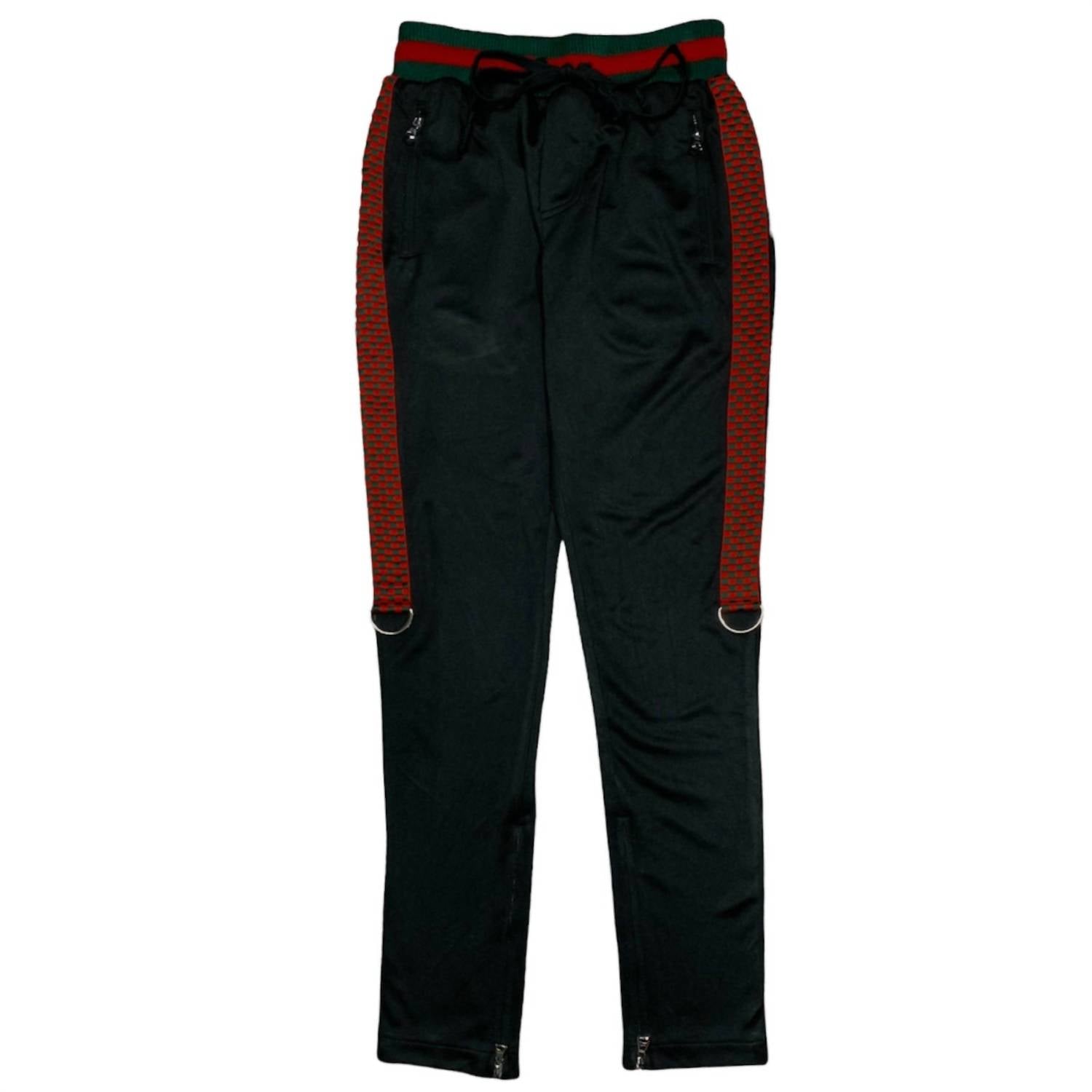 Black Lifted Anchors pant with green/red checkered leg strip pattern, metal loops, and green/red striped waistband.