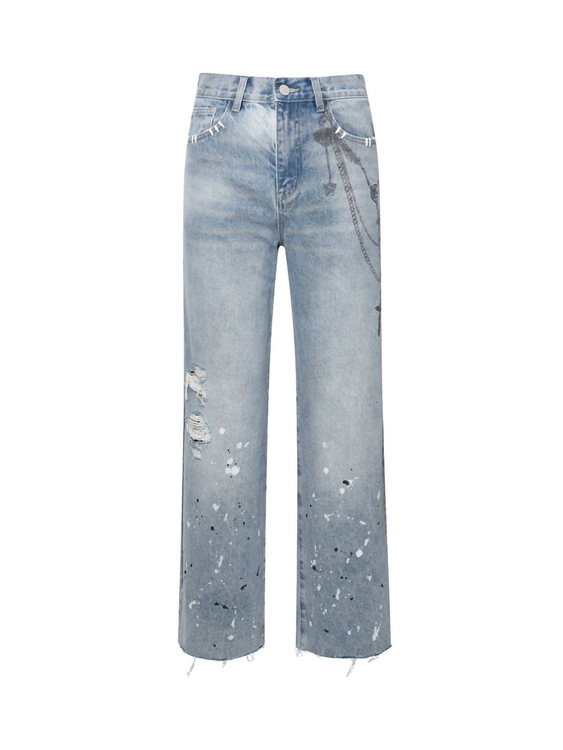 Birth Of Royal Child - Chain Ink Print & Fray Distressed Jeans