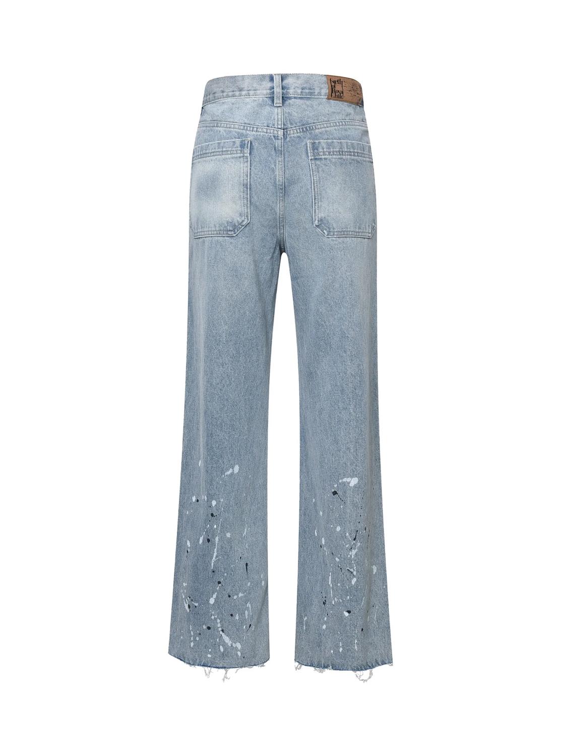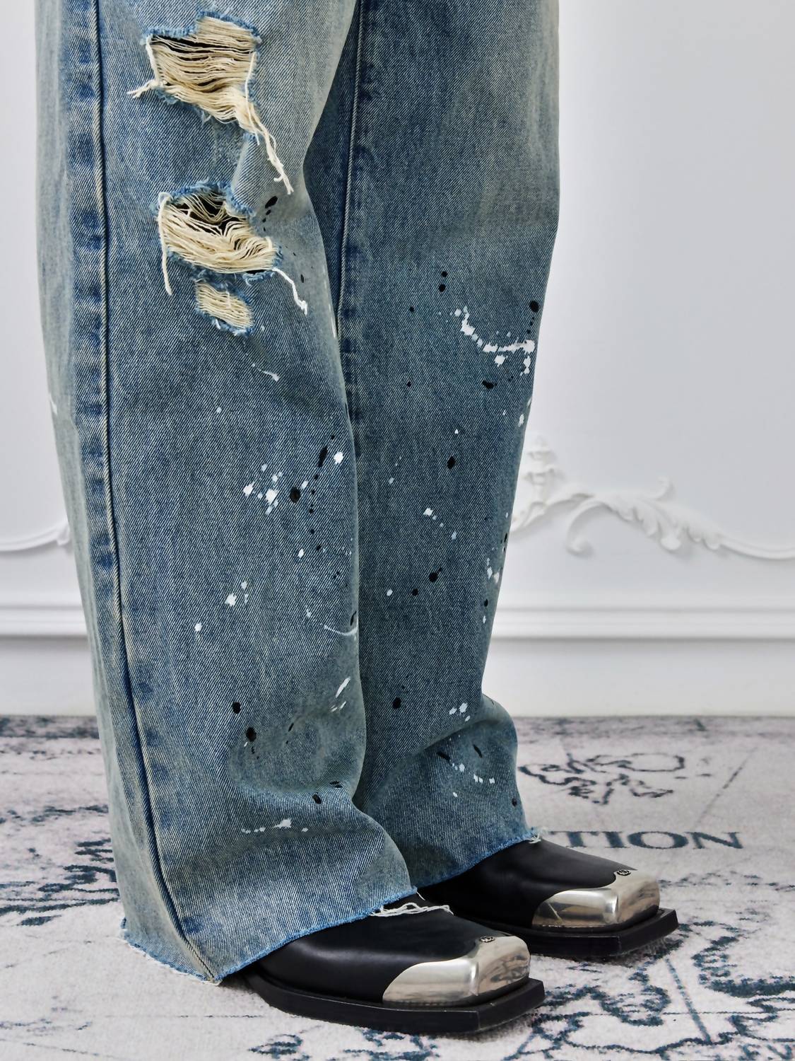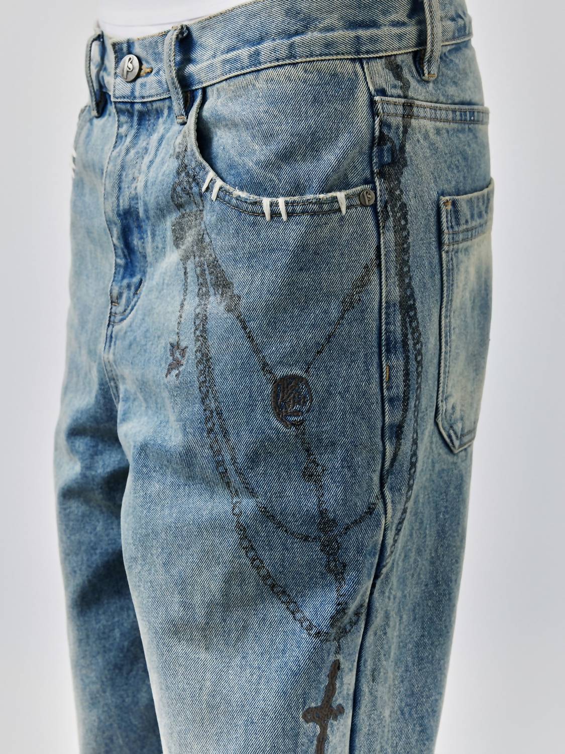 Discover the Chain Ink Print & Fray Distressed Jeans by Birth of Royal Child, a perfect blend of artisanal craftsmanship and vintage-inspired flair. These blue, straight-leg jeans are crafted from 14.5oz Japanese Okayama denim with a relaxed fit, featuring hand-applied splatter, layered embroidery, and aged prints for added depth. Material: 100% Cotton. Closure: YKK Zip closure. Inseam: 30". They're ideal for a spring evening event with a light wash and custom hardware.