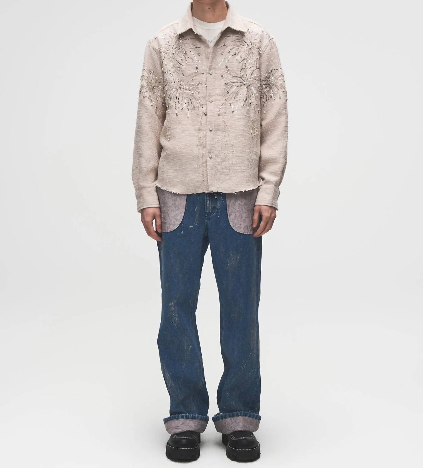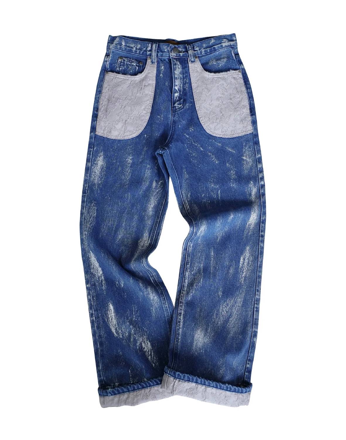 Introducing the Embossed Silver Washed Denim Straight Jeans by Birth of Royal Child, designed for a stylish evening event. These medium wash blue jeans feature a relaxed fit with a straight leg and a striking Japanese embossed floral pattern with a laser-burnt design on the pockets. Crafted from 100% cotton denim, they offer a modern twist with a silver-painted finish and an inseam of 32 inches. Closure is secured with a zip, and the cuffs can be rolled up for a versatile look. Ideal for those seeking a blend of vintage charm and contemporary flair.