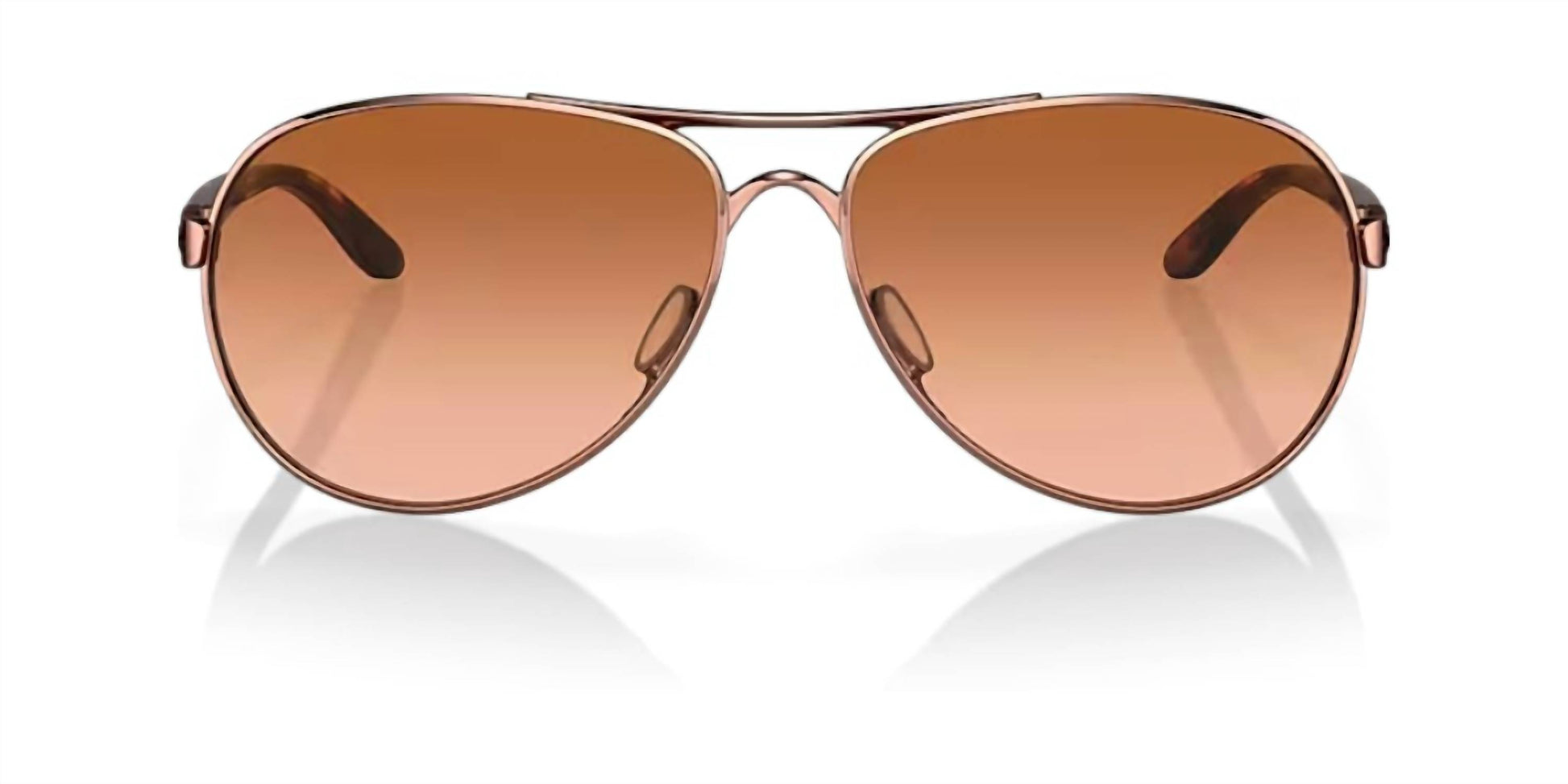 Presenting the Men's Feedback Aviator Sunglasses by Oakley, a blend of luxury and function with their ultra-lightweight C-5 frame material in Polished Chrome and Rose Gold. These gradient sunglasses come equipped with Prizm Sapphire, Prizm Tungsten, and Vr50 Brown Gradient lenses, offering a stylish look and enhanced vision. Designed for regular fit with a 135 mm temple length and adjustable nosepads for personalized comfort. Ideal for those who appreciate both style and practicality.