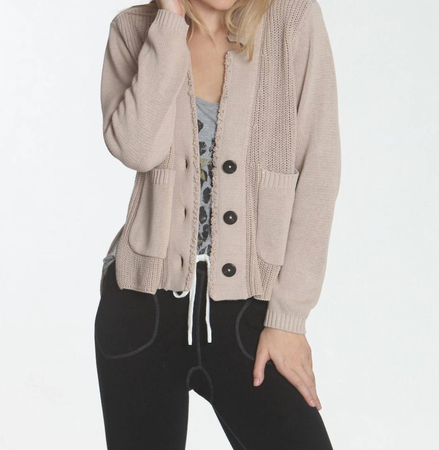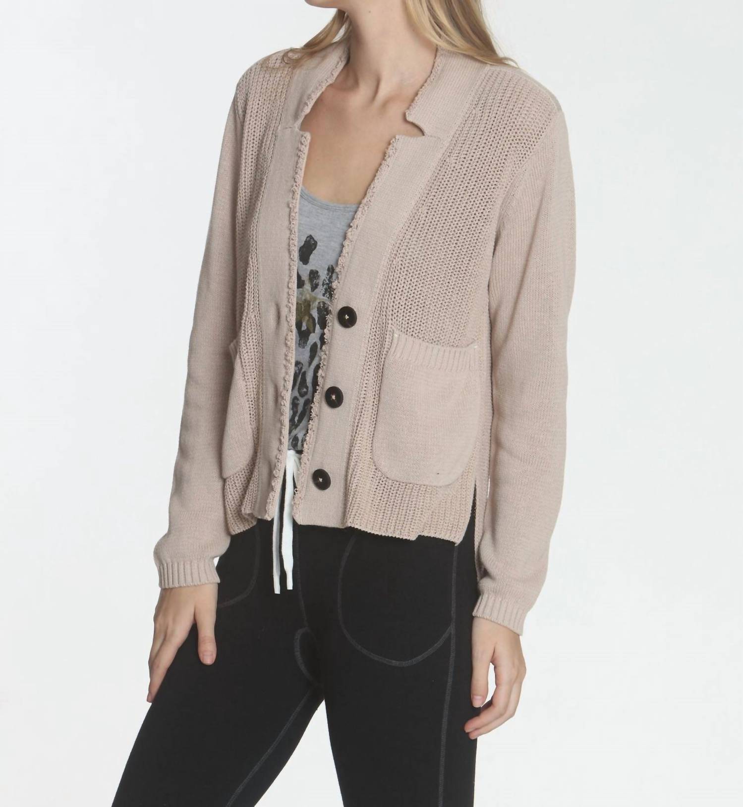 Discover the Women's Natalie Blazer by LABEL+thread, a minimalist cardi blazer in a soothing sand hue perfect for the fall season. With long sleeves and a hip-length design, this textured piece is crafted from 100% cotton, ensuring both comfort and a relaxed fit. It features a V-neck, pull-on closure with genuine horn buttons, and practical patch pockets for your essentials. Care instructions: Hand wash for longevity.