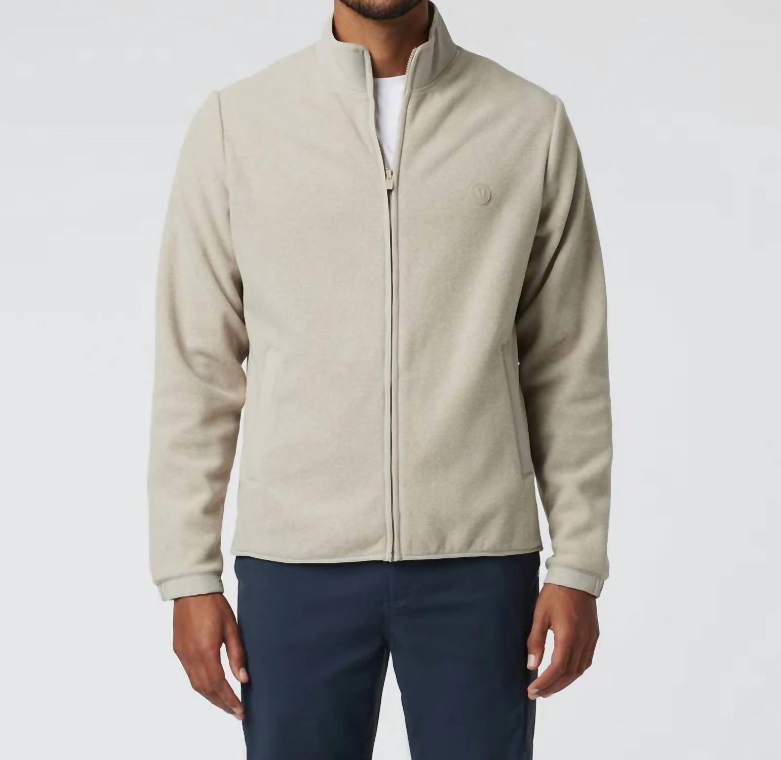 The Vuori Aspen Full Zip Jacket in Toast is a practical men's wardrobe addition, crafted from 100% recycled polyester Polartec® Wind Pro fleece for reliable water and wind resistance. This piece features a zip closure and a collared neckline, designed for both utility and style with long sleeves and convenient pockets. Care: Machine wash cold with like colors; tumble dry low.