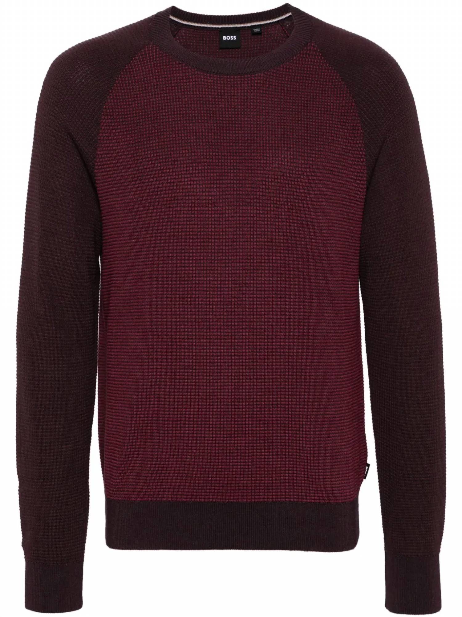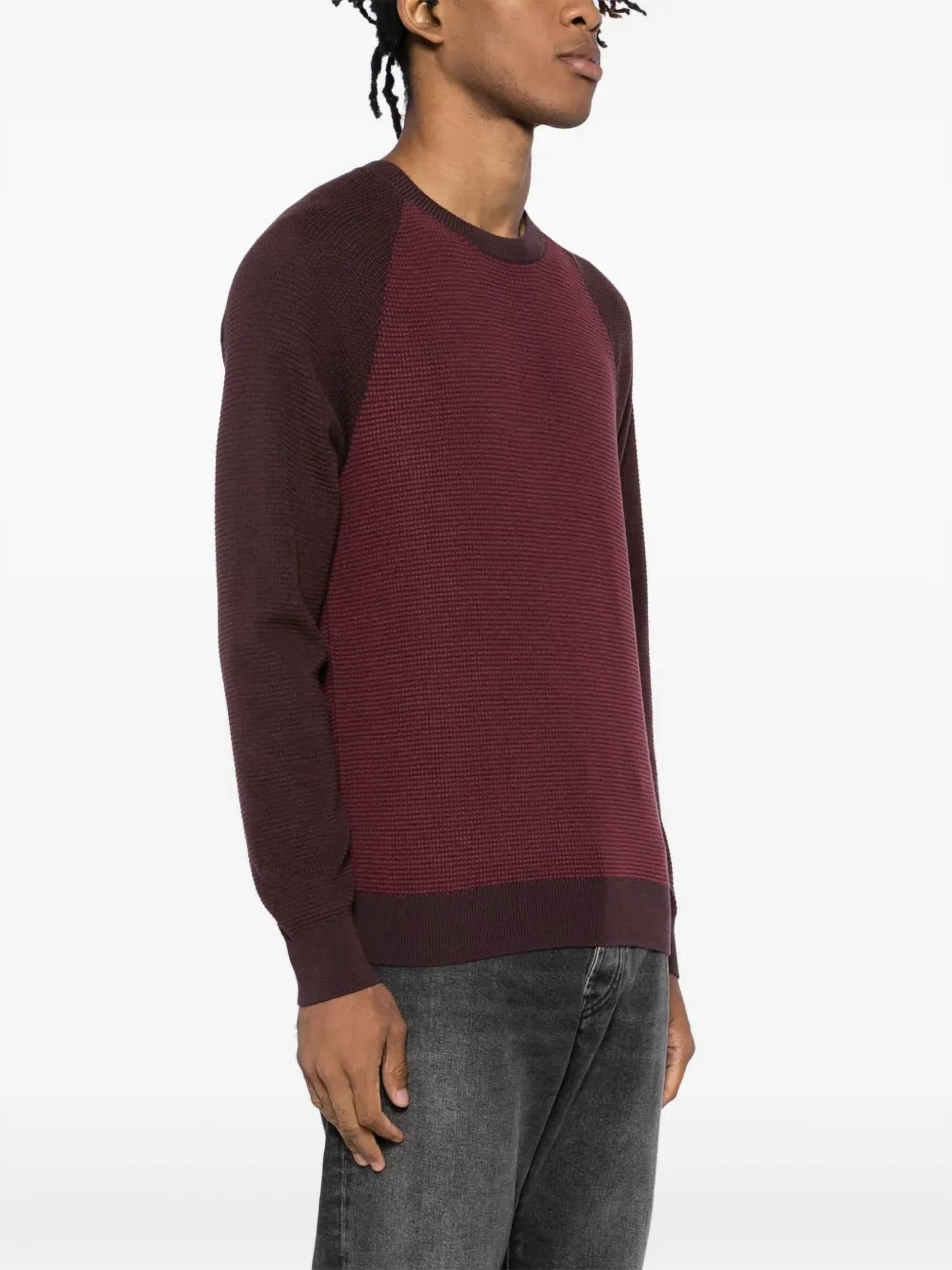 Stylish sweater in two-tone red. Features long sleeves and crew neckline. Sophisticated knitted construction. Crafted from a luxurious blend of 74% virgin wool and 26% cotton. With ribbed cuffs and hem. Ensures a comfortable fit. Designed with a convenient pull-on closure. Suitable for machine washing. Offers both elegance and practicality.