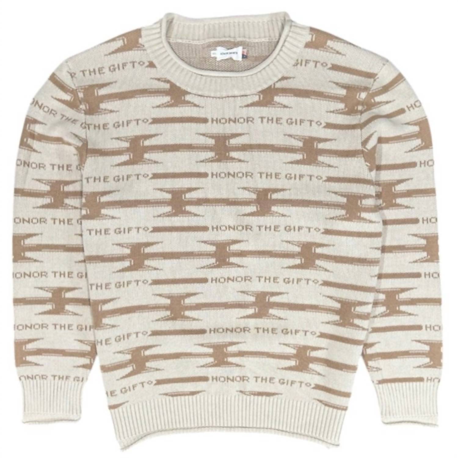 Stylish winter essential in a brown hue. Crafted from high-quality cotton. Long sleeve crewneck pullover features a striking repeat logo pattern with "Honor The Gift" text and an "H" wire design. With a trendsetting streetwear vibe, perfect for vacation occasions. Pull-on style. Dry clean only.