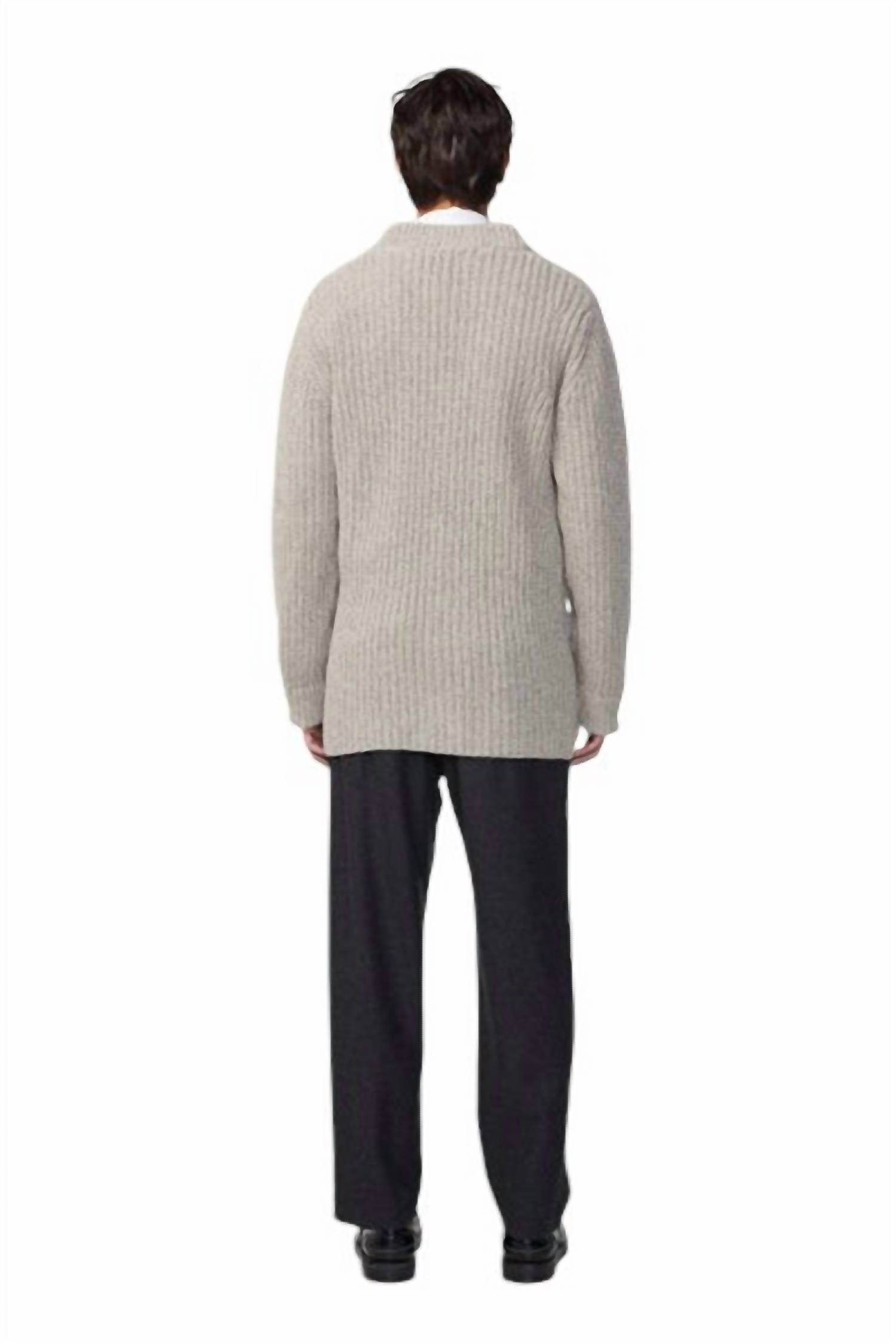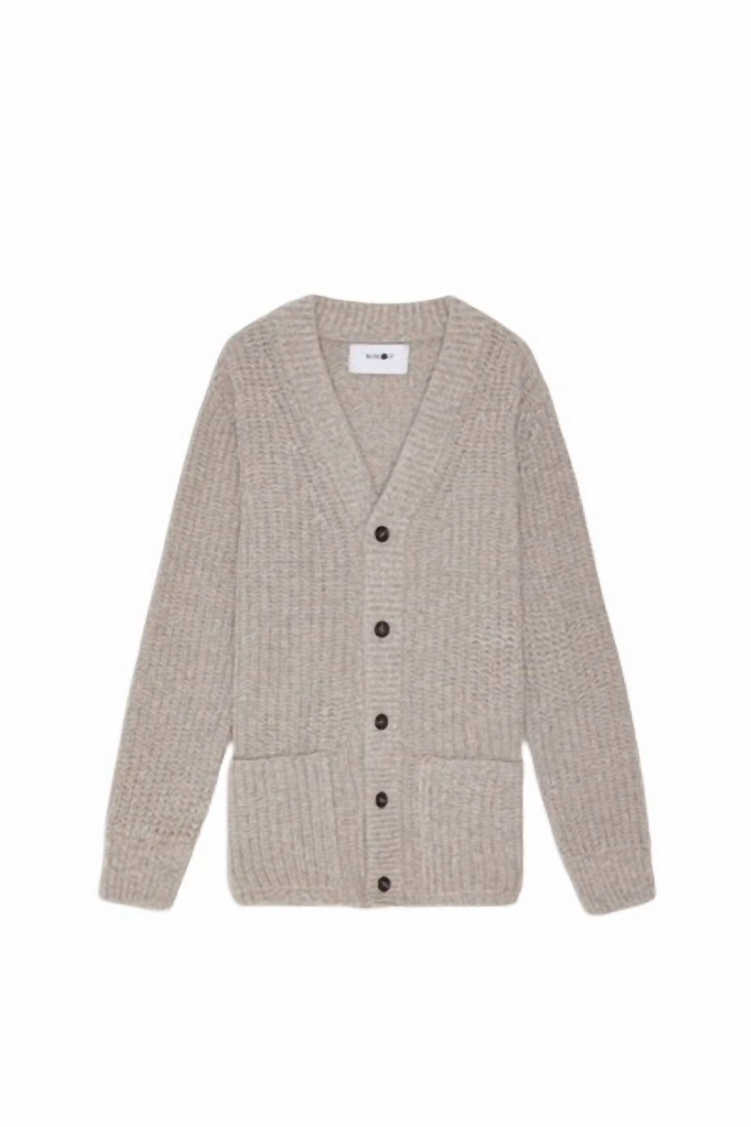 Chunky ribbed v-neck cardigan knit in recycled wool blend. Designed for a slightly oversized fit. Topped with earthhorn buttons and dual patch pockets. Relaxed fit. 70% Recycled wool 25% Recycled Polyamide 5% Other fibers. Made in Tunisia.