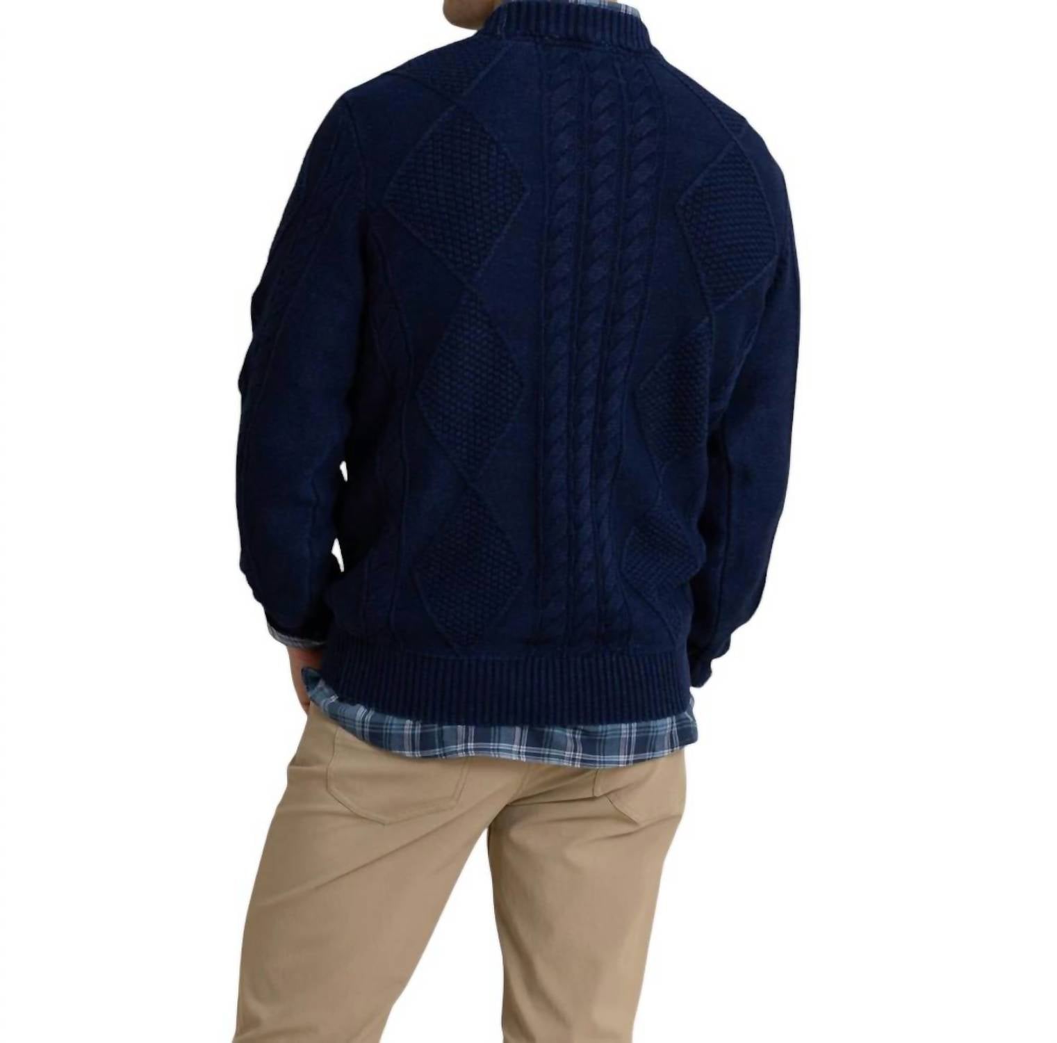 Introducing the Broad River Indigo Crew Sweater by SOUTHERN TIDE, perfect for adding timeless style to your wardrobe. This men's long sleeve sweater boasts a striking true indigo dye with a unique bleach wash, coupled with a fisherman's cable intricate all-over design. Made from 100% Cotton, it features a comfortable crewneck with rib collar and cuffs, offering a refined finish. Closure: Pull on. For easy care, machine wash cold to maintain its rich dark indigo hue.