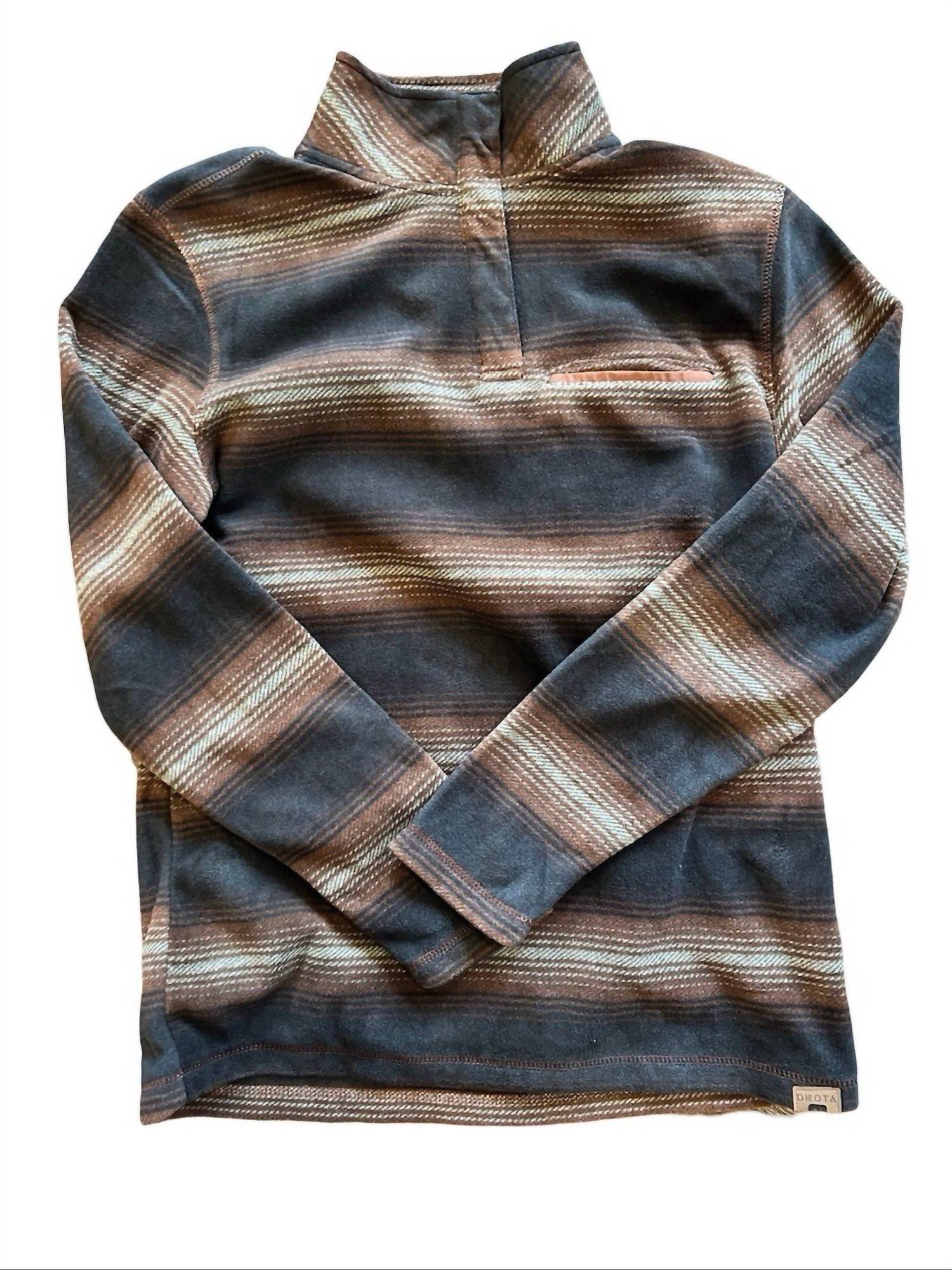 Versatile piece in a stylish Canyon-colored stripe pattern. Crafted from premium 200GSM micro filament with a soft, double-brushed finish. Features a distinctive ripstop trim. Includes a practical snap closure and a precision-cut chest pocket. Enhanced by an embroidered placket chevron.