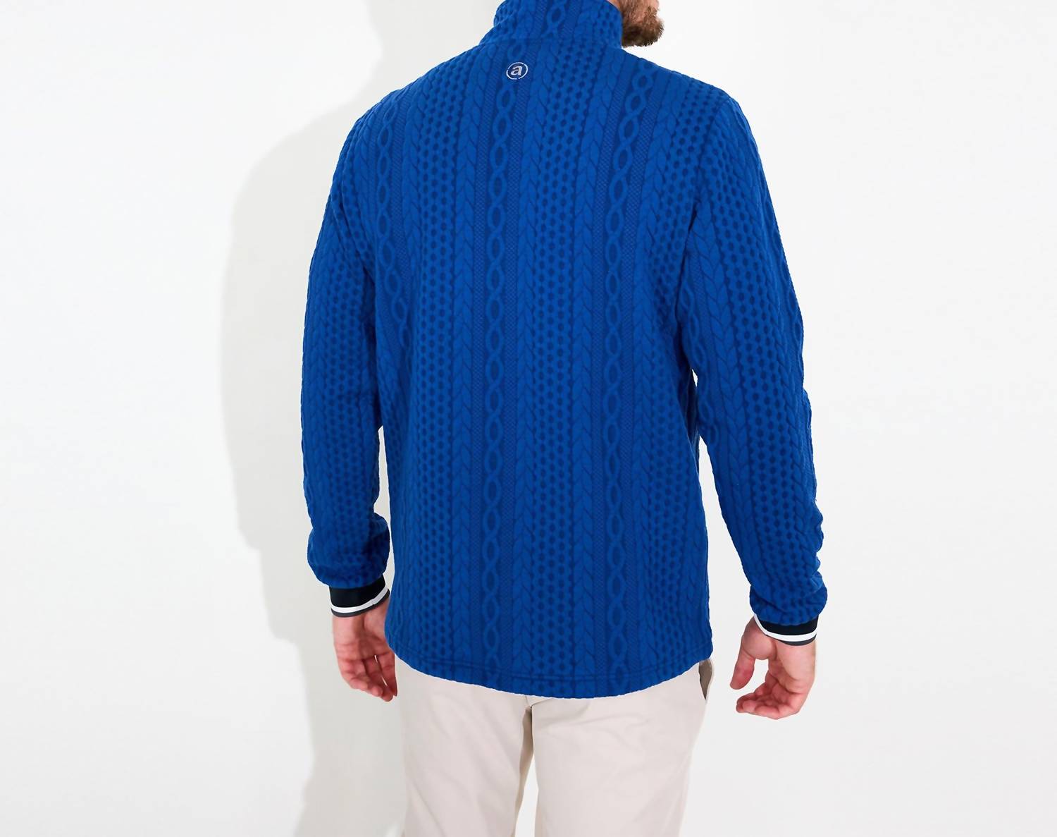Introducing the Woburn Midlayer Half Zip Sweater by Abacus Sportswear US, a perfect blend of style and functionality in Atlantic Blue. This men's long sleeve turtleneck features a cable knit pattern with contrast colored details, adding a touch of sophistication to your athleisure wardrobe. The sweater offers a zip closure and is designed with a stretchy fabric for comfort and a customizable fit, thanks to the drawstring at the bottom. Easy to care for, the sweater can be machine washed and tumble dried, making it an ideal choice for game day outings.