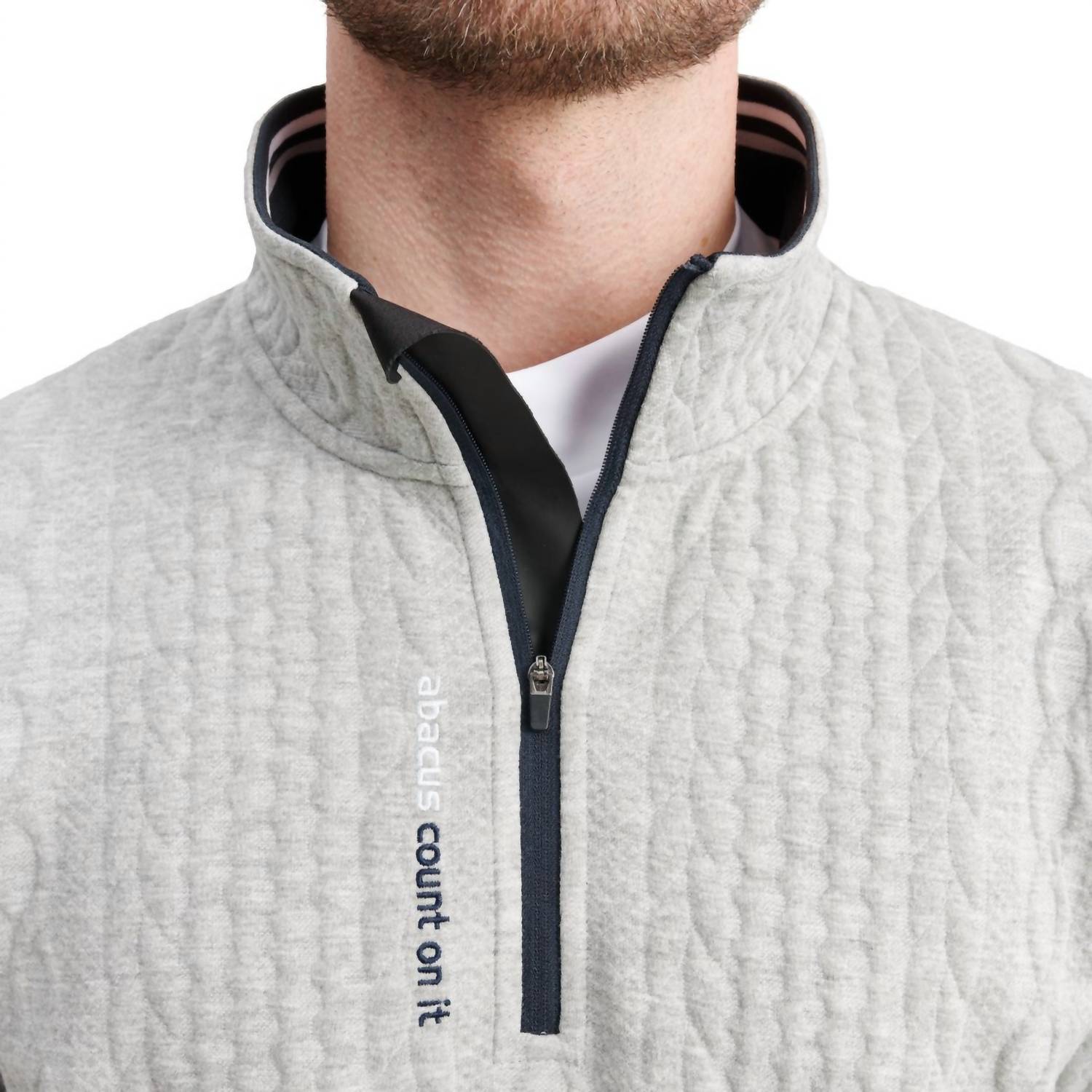 Introducing the Woburn Midlayer Half Zip Sweater by Abacus Sportswear US, a perfect blend of function and style in Light Grey Melange. This long-sleeve sweater is crafted with a solid cable knit pattern, featuring a mockneck and contrast colored details, ideal for game day or leisurely spring outings. The zip closure allows for easy wear while the drawstring at the bottom ensures a customizable fit. Care instructions are simple: machine wash and lay flat to dry.