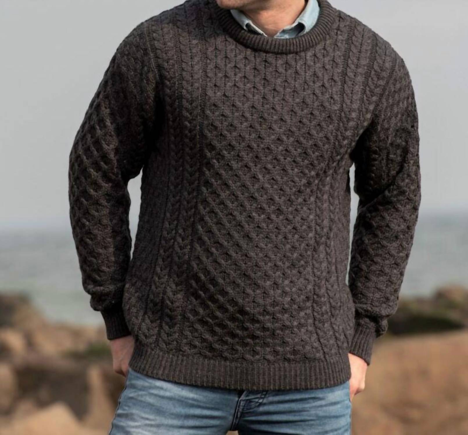 Elevate your wardrobe with the Damson Merino Crewneck Sweater by Aran Crafts, a standout piece in textured charcoal. This long sleeve sweater is crafted from 100% Merino wool, showcasing traditional Irish Aran stitching patterns that celebrate heritage and storytelling. Its pull-on style ensures comfort and ease while embracing the monochrome trend, making it ideal for fall vacations. Care for this fine piece by hand washing and laying flat to dry.