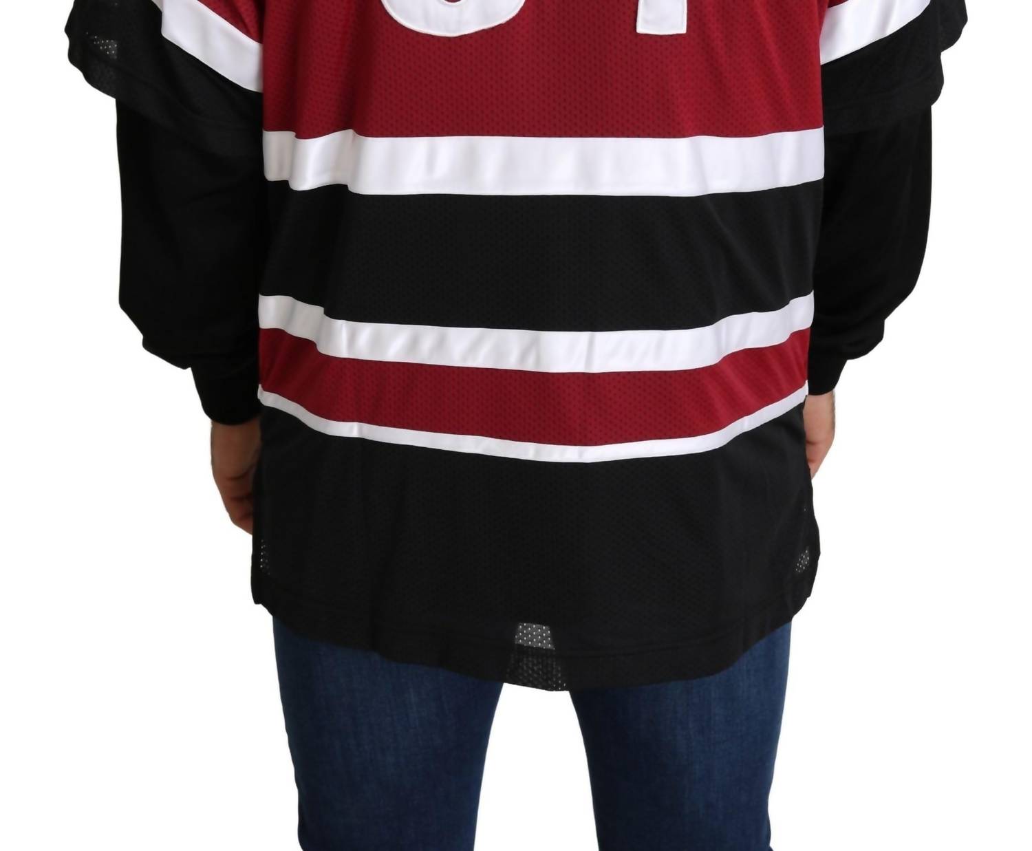 Presenting the Dolce & Gabbana Amore Sport Full Zipper Sweater, a must-have for the modern streetwear enthusiast. This stylish piece features long sleeves and is crafted from 80% Nylon and 20% Polyester, offering a regular fit. Made in Italy, this sweater showcases a striking graphic design in black, red, and white, complete with the iconic AMORE crown logo. Closure: Full zipper; Care instructions are not provided.