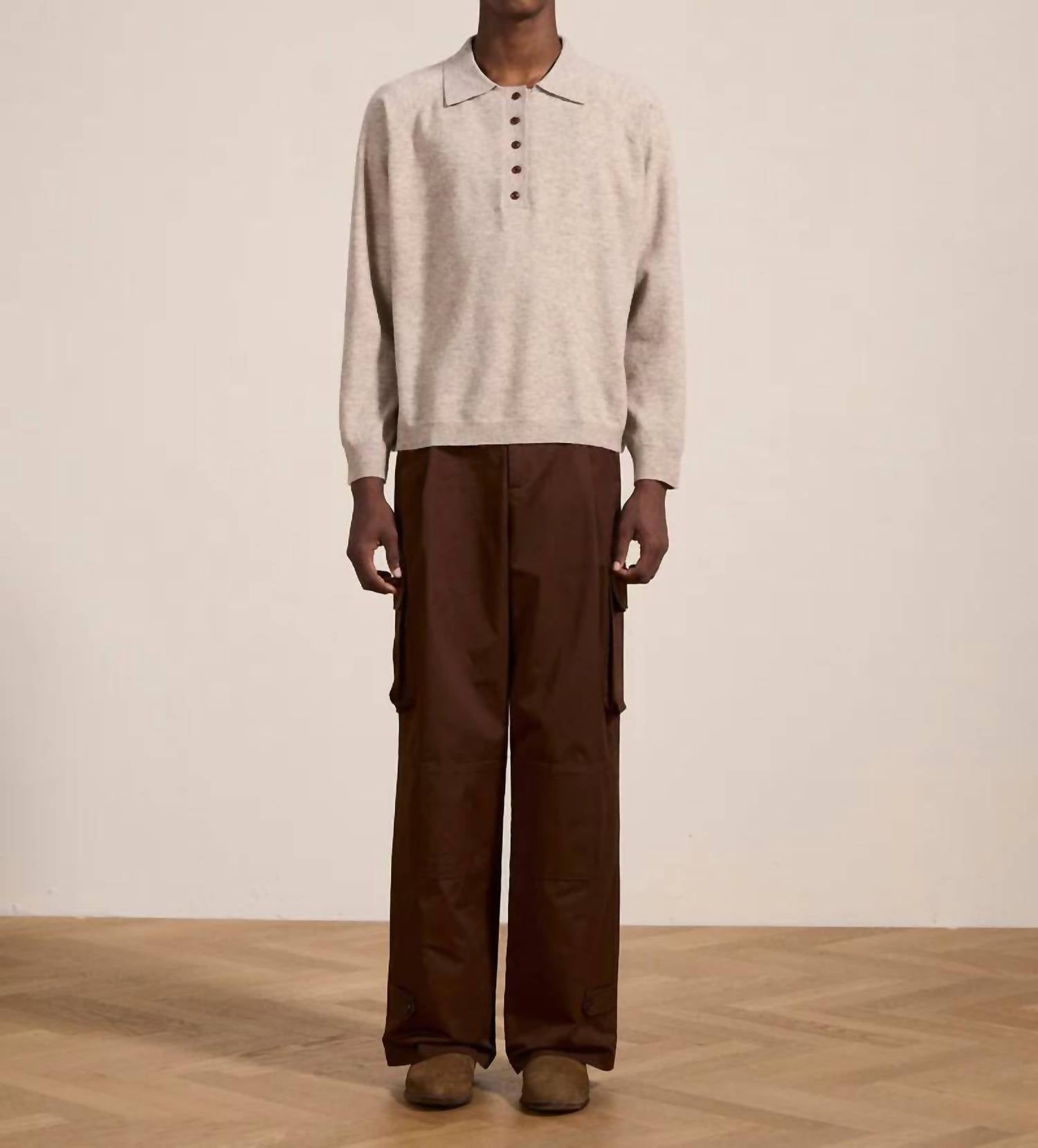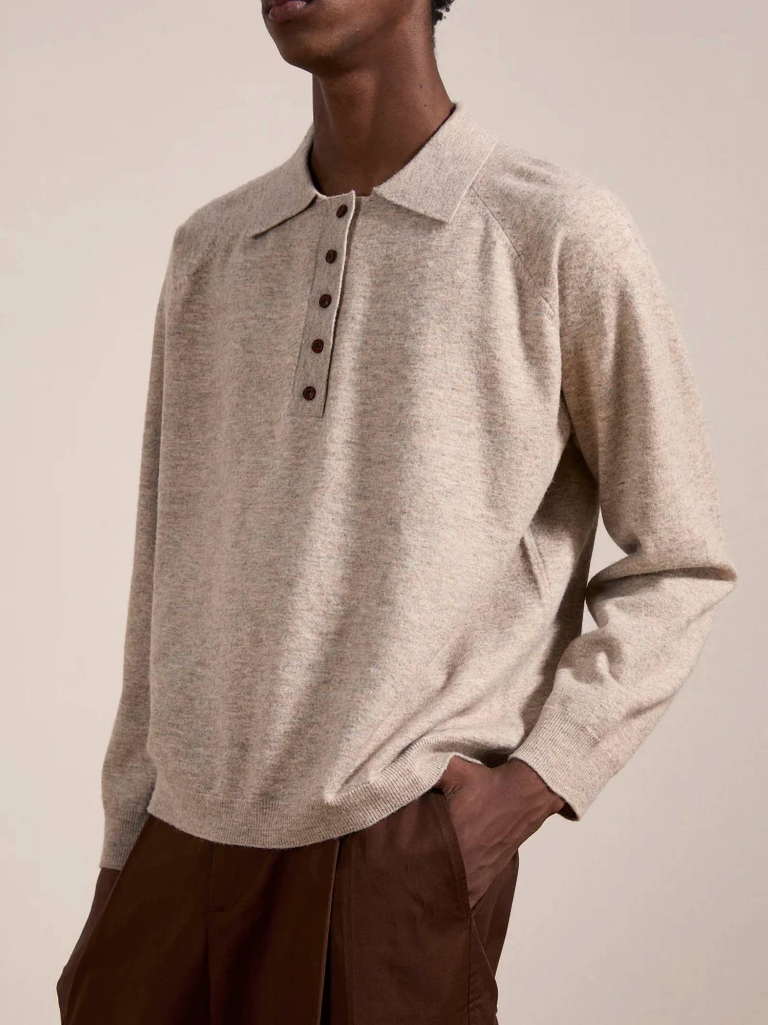 Discover the Hay Collared Knit Henley Sweater by Found, an elevated take on a classic style in light brown. This men's long sleeve piece features a sophisticated collar and raglan sleeve design, crafted from a unique blend of 61% Polyester, 15% Acrylic, 15% Imitation Nylon, and 6% Wool, making it perfect for all seasons. Closure: Button closure with wooden buttons adds a charming touch. Care Instructions: Machine wash and tumble dry for convenience, offering style and ease for your travels.