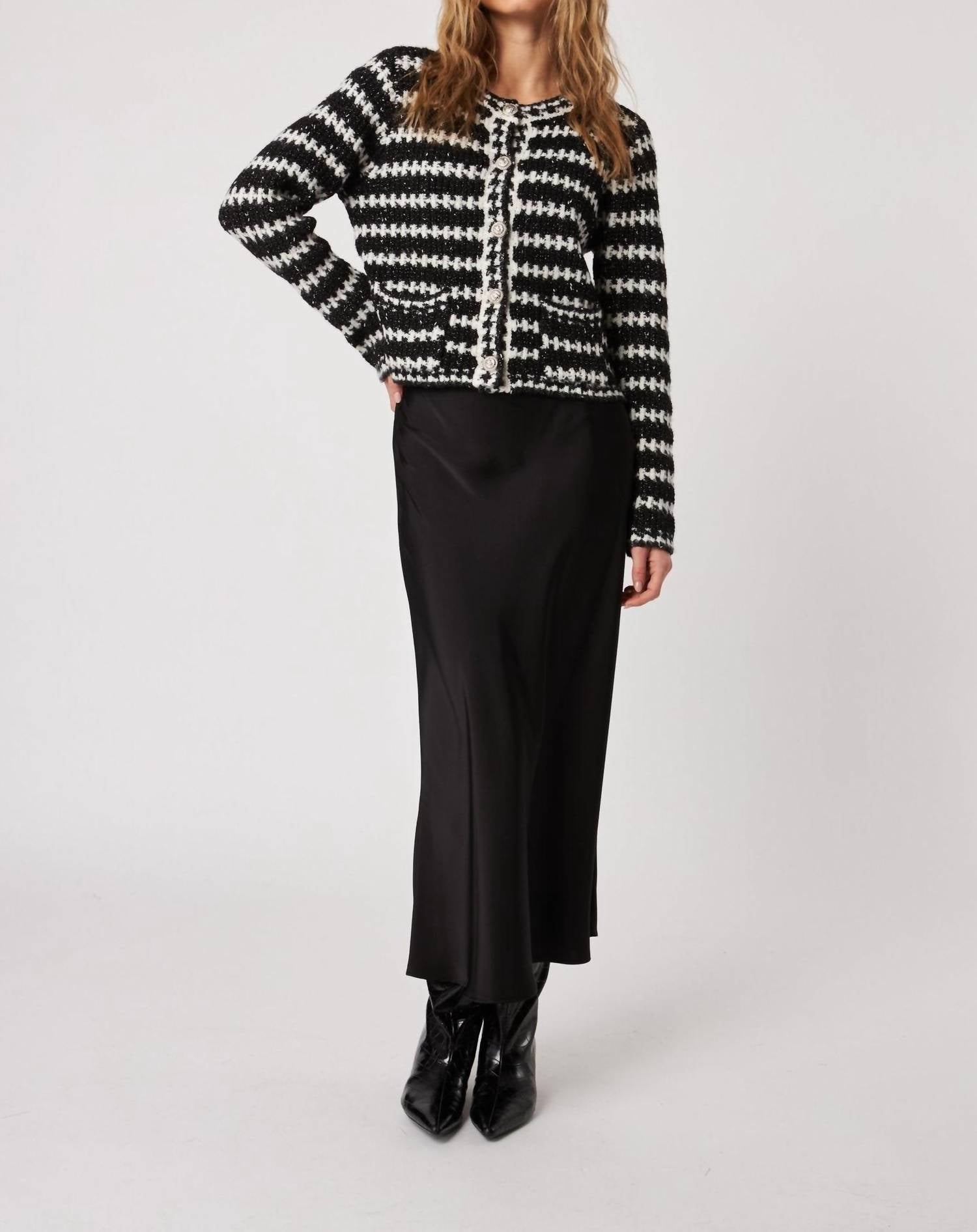 Elevate your fall wardrobe with the Henri Striped Cardigan by JOHN + JENN, crafted for women with a maximalist flair. This black long sleeve cardigan features a textured pattern and a chic collar neckline, perfect for a New Year's Eve dinner party. Enhance the ensemble with its practical pockets and classic button closure. Ideal for the cooler seasons, this cardigan is effortlessly stylish in the alluring hue of Caviar Quartz.