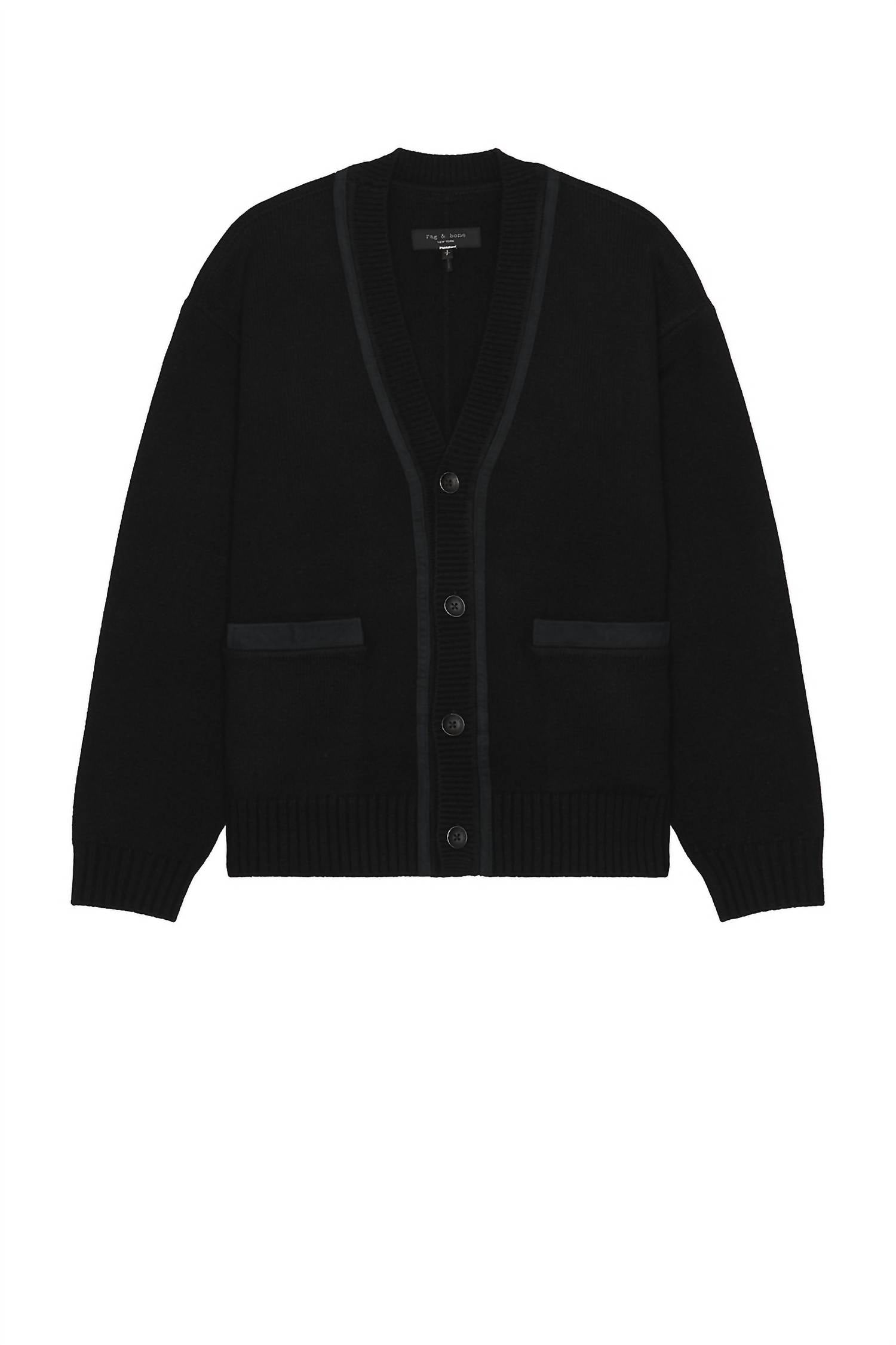 Discover the Clarkson Suede Cardigan by Rag & Bone, an effortlessly stylish piece perfect for a minimalist wardrobe. Crafted from 100% wool with 100% sheepskin trim, this midweight knit offers a luxurious feel. This black cardigan is made in China and features long sleeves, a V-neck, front button closure, and convenient front slip pockets. For care, professional dry clean is recommended.