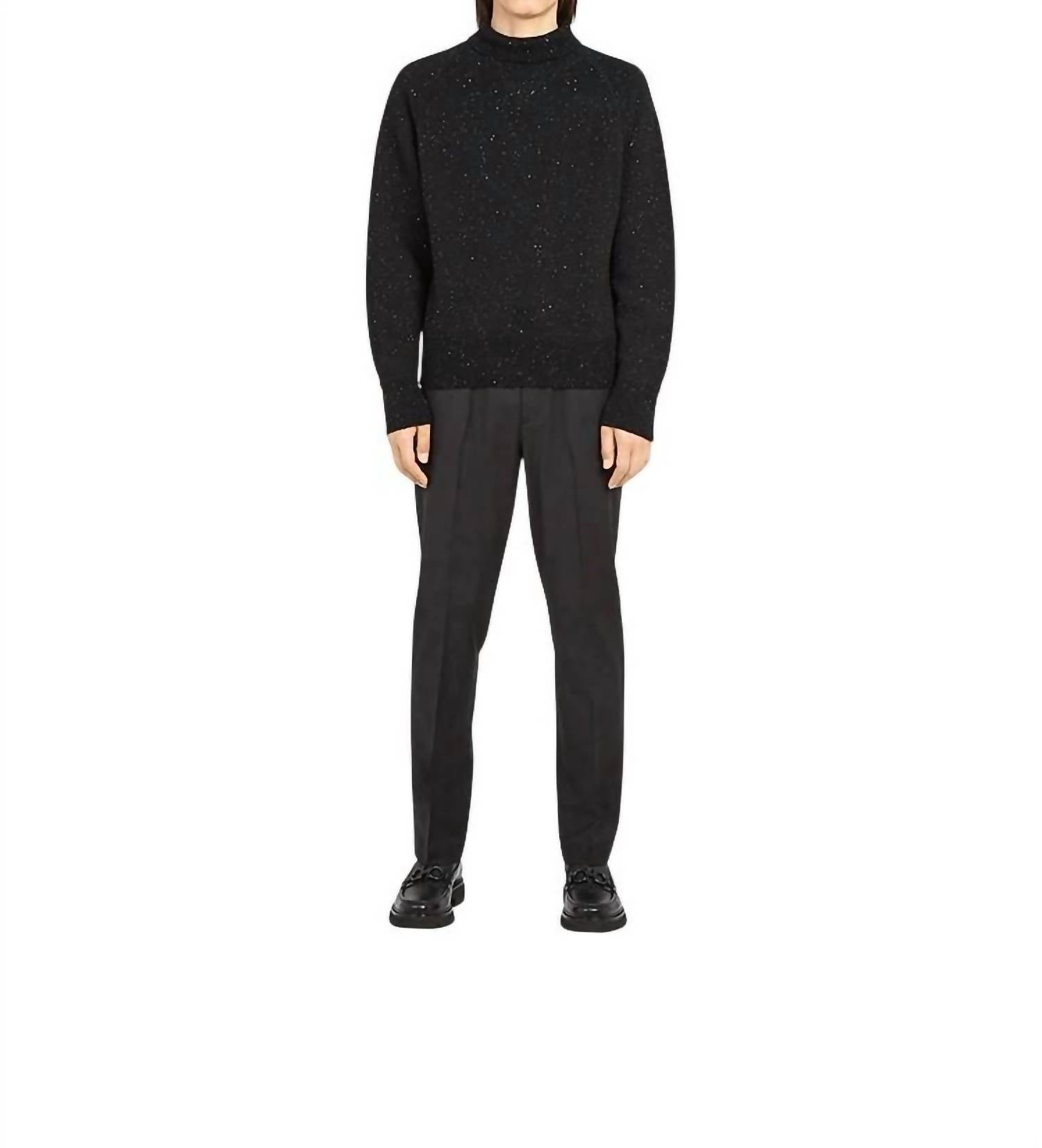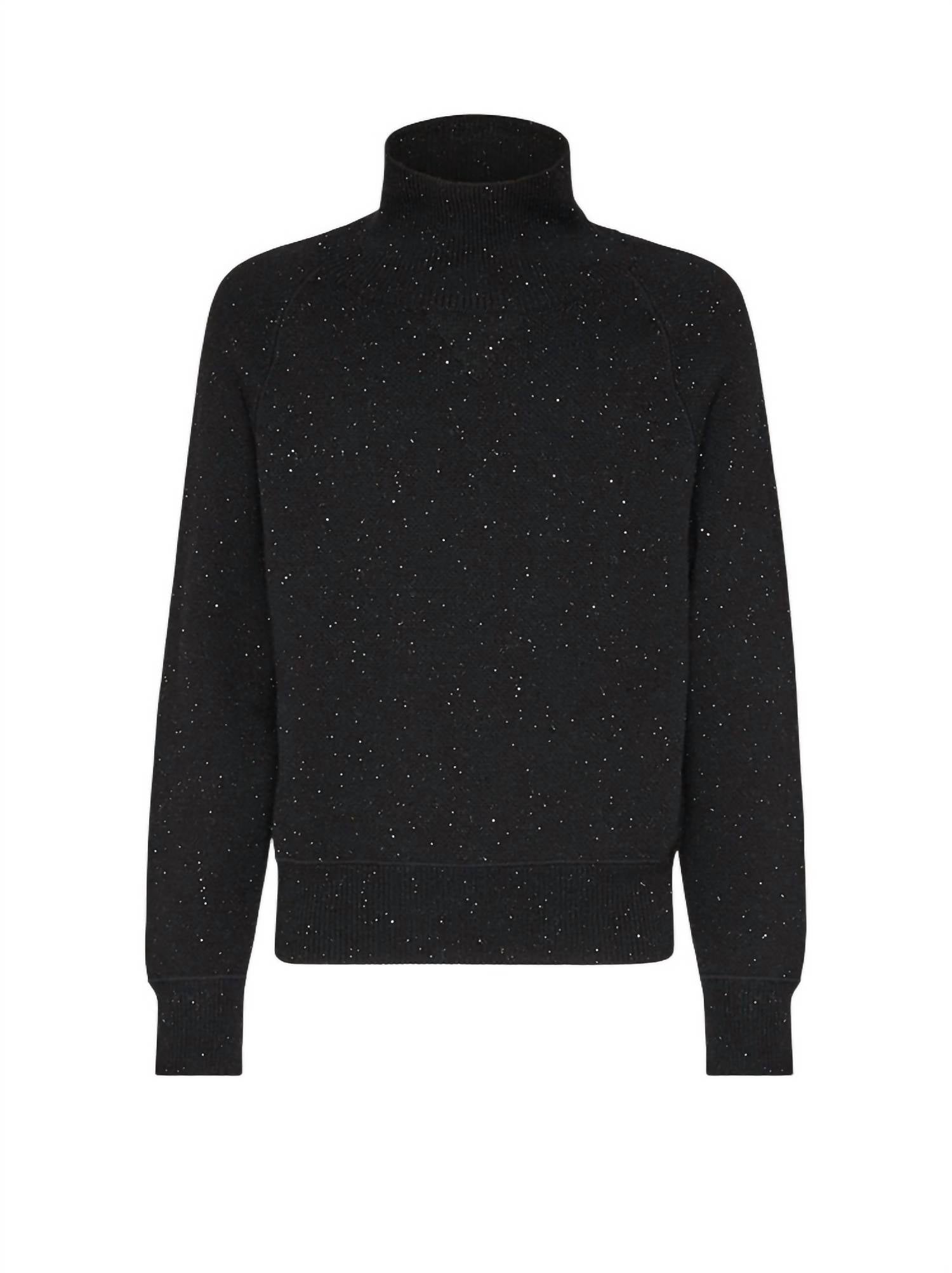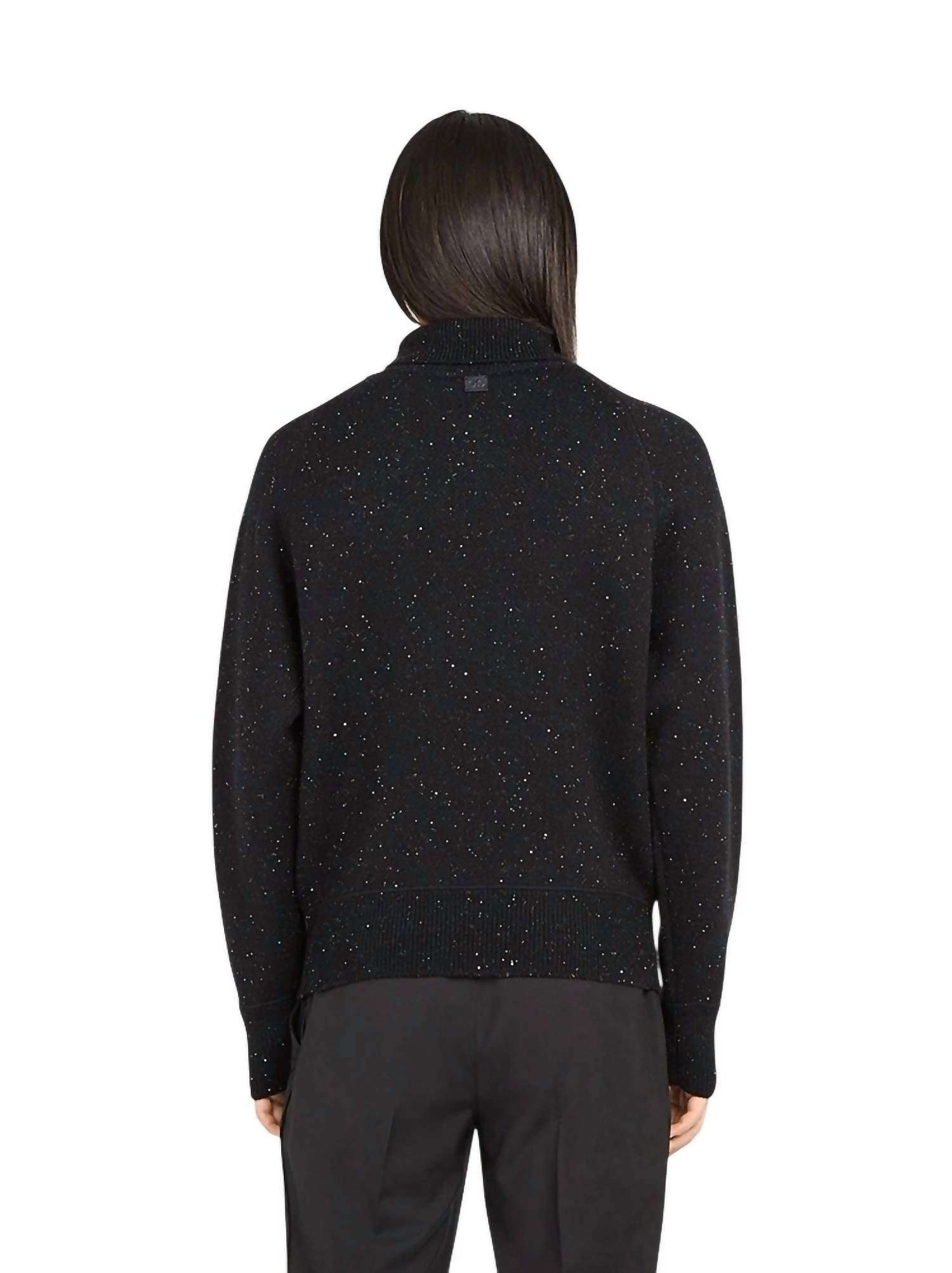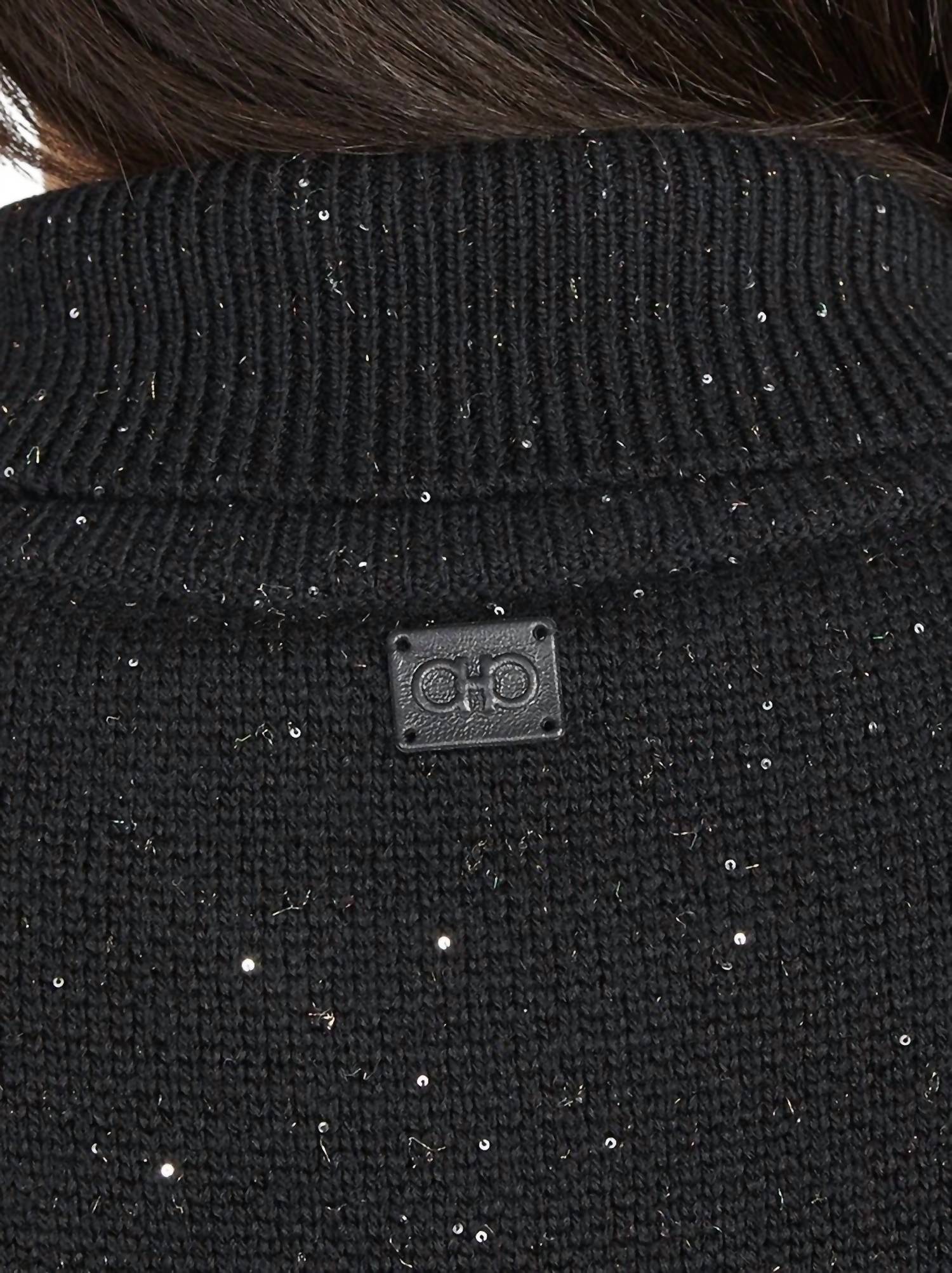 The Tinted Sequined Turtleneck Sweater by Salvatore Ferragamo is a chic choice for Fall, adding a touch of quiet luxury with its intricate weave. This black turtleneck, featuring long sleeves, is crafted from a sumptuous blend of 74% pure virgin wool, 14% cashmere, 6% viscose, 5% silk, and 1% polyamide. Made in Italy, this pull-on sweater boasts a textured pattern illuminated by micro sequins, complemented by a subtle Gancio leather tag on the back for a refined finish. Please note that specific care instructions are not provided.