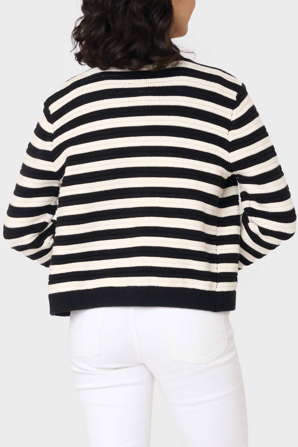 Stay cozy and stylish with the Sanctuary Knitted Jacket in Chalk and Black Stripe. This cardigan features long sleeves and a cotton blend composition (57% Cotton, 25% Nylon, 18% Polyester). Measuring 22" in length for a size small, it offers a crewneck and a convenient button closure, complete with functional pockets. Perfect for holiday parties, it's made for easy care: machine wash cold and line dry. Sabrina, standing at 5'7", is wearing a size XXS.