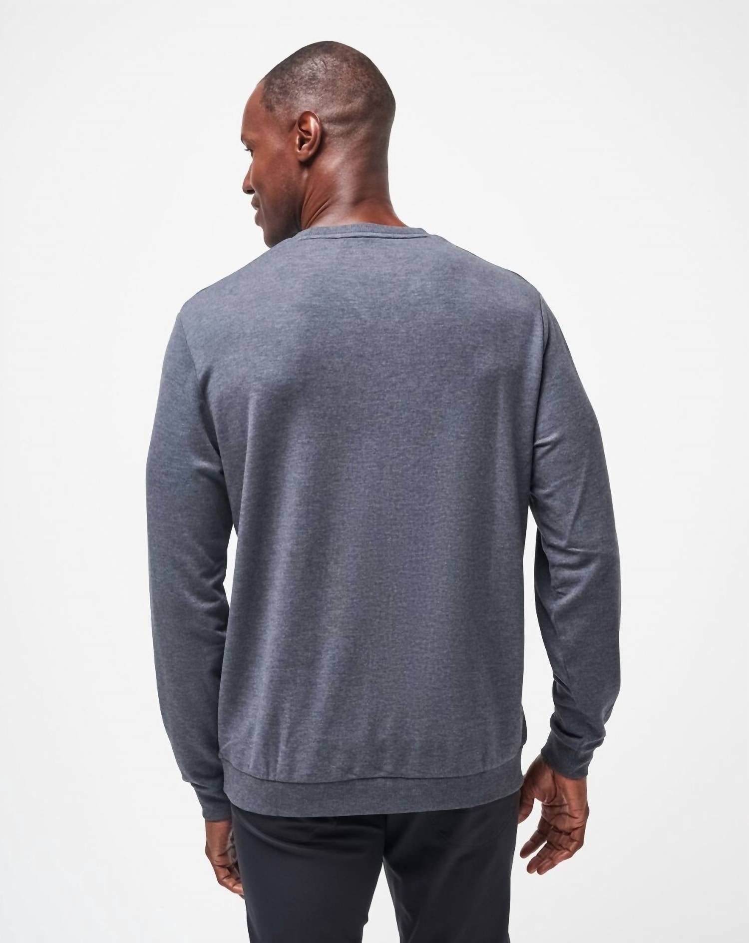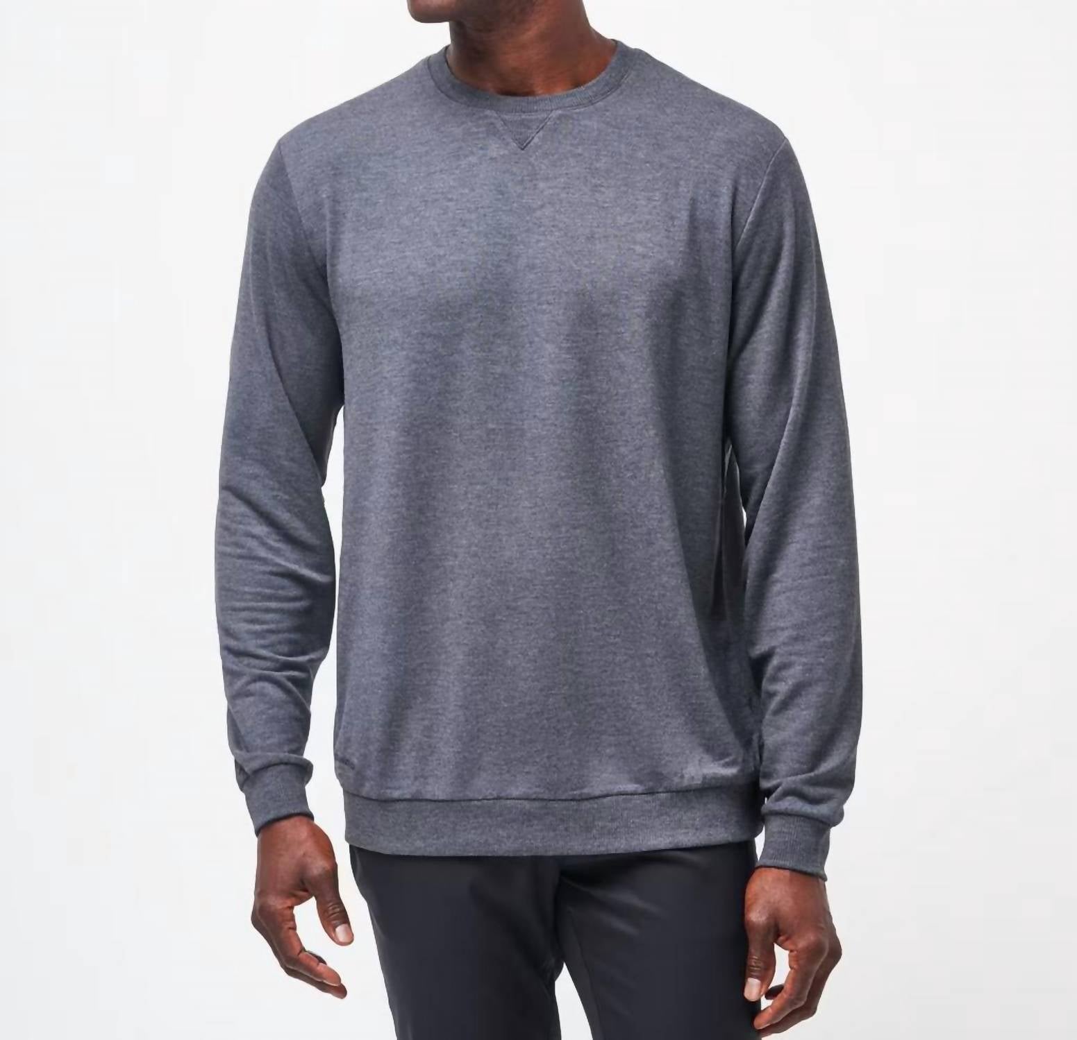 Meet the Amenities Crew Sweater by TravisMathew, designed for the modern man in a sophisticated heather dark grey hue. This men's crewneck sweater features long sleeves, offering a stylish and preppy look perfect for a holiday party. Made from soft Modal/polyester/spandex material, it's a pleasure to wear throughout the winter season. With a convenient pull-on design, it combines comfort and ease for any casual occasion.