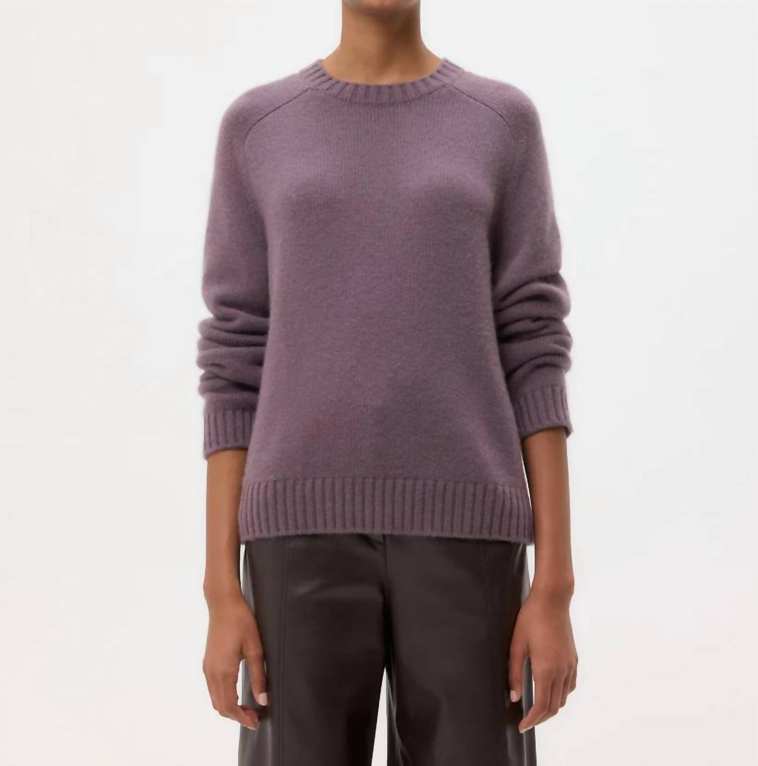 Experience the refined luxury of the Jill Crewneck Sweater by TWP, exquisitely crafted in smoked lavender for a minimalist, vacation-inspired style. This women's sweater boasts long sleeves and a classic crewneck, meticulously knitted in five-gauge Italian cashmere, guaranteeing top-tier softness. Designed with a boxy fit and detailed with ribbed finishes at the collar, cuffs, and hem, it ensures both comfort and elegance. Composition: 100% Cashmere. Closure: Pull on. Care: Machine wash. Ideal for the fall season.
