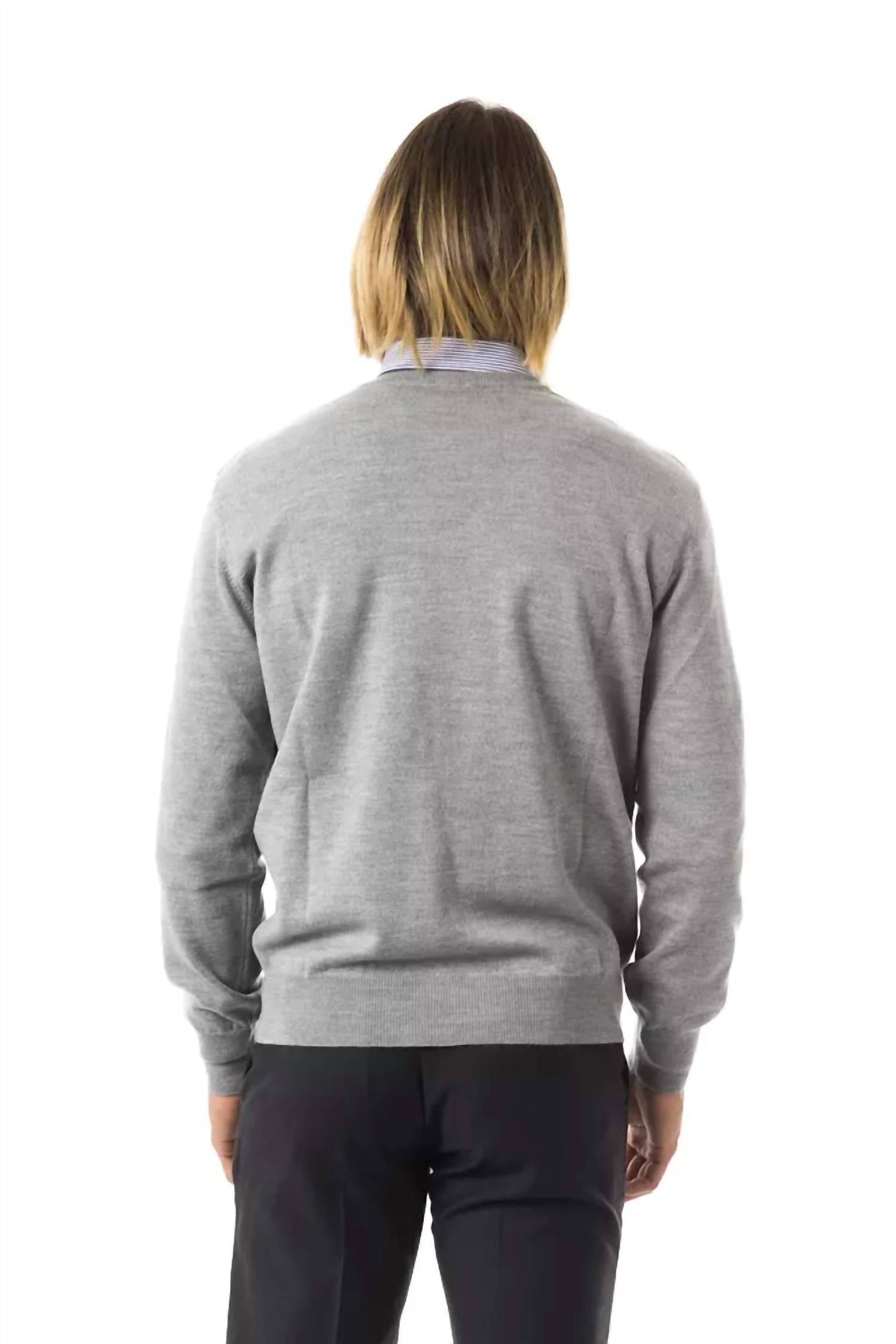 Introducing the Embroidered Woolen V-neck Sweater by Uominitaliani, a sophisticated choice for your fall holiday gatherings. This gray sweater features long sleeves and a classic V-neckline, designed to keep you in style and comfort. Made from luxurious wool, it offers a solid pattern with a pull-on closure for ease of wear. Please follow unspecified care instructions to maintain the quality of this men’s holiday party essential.