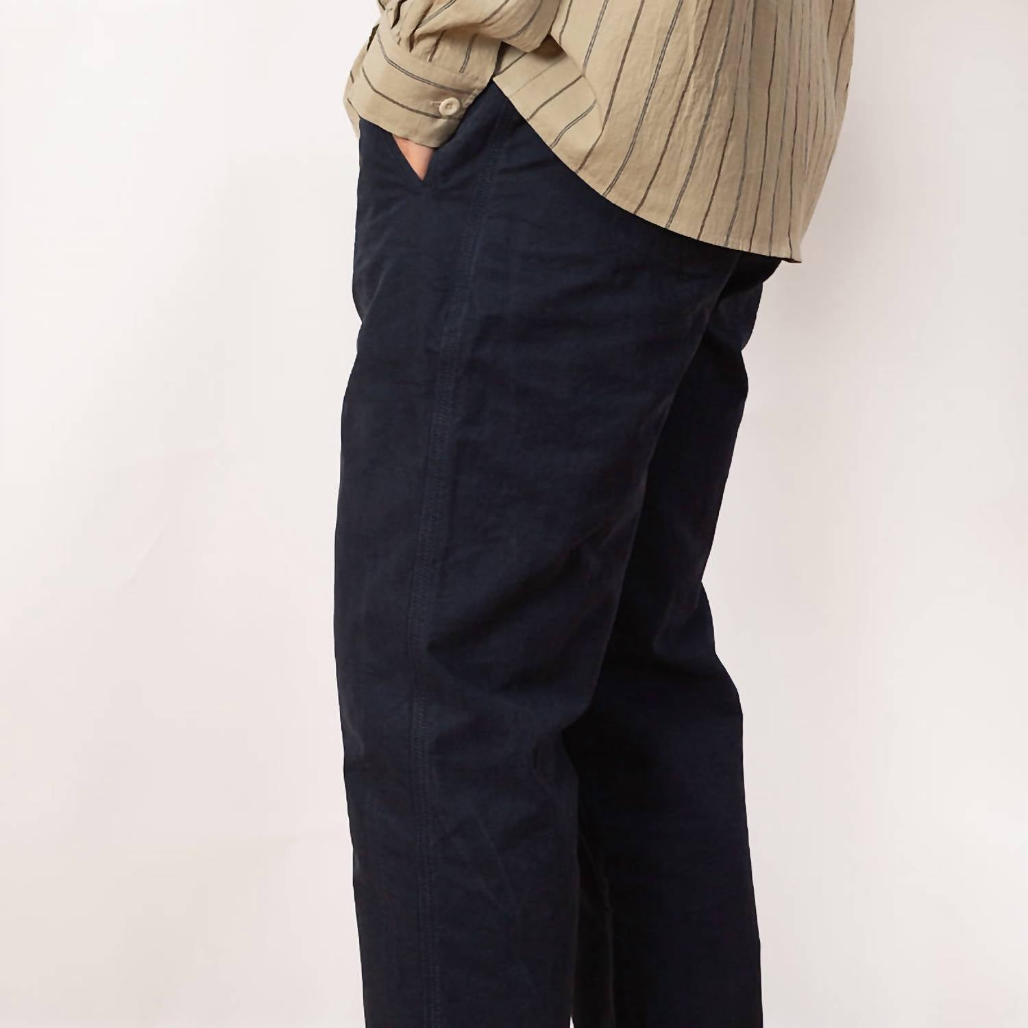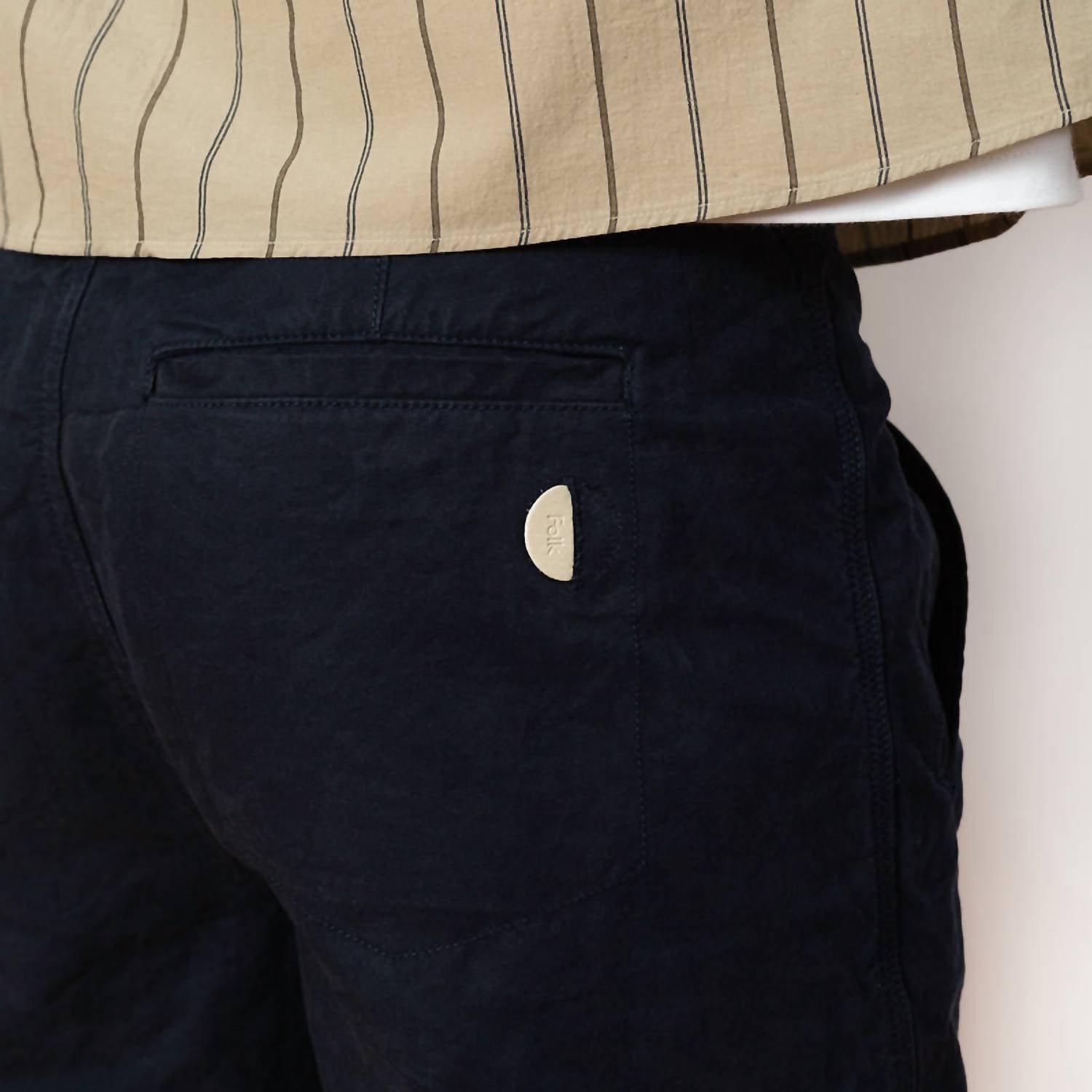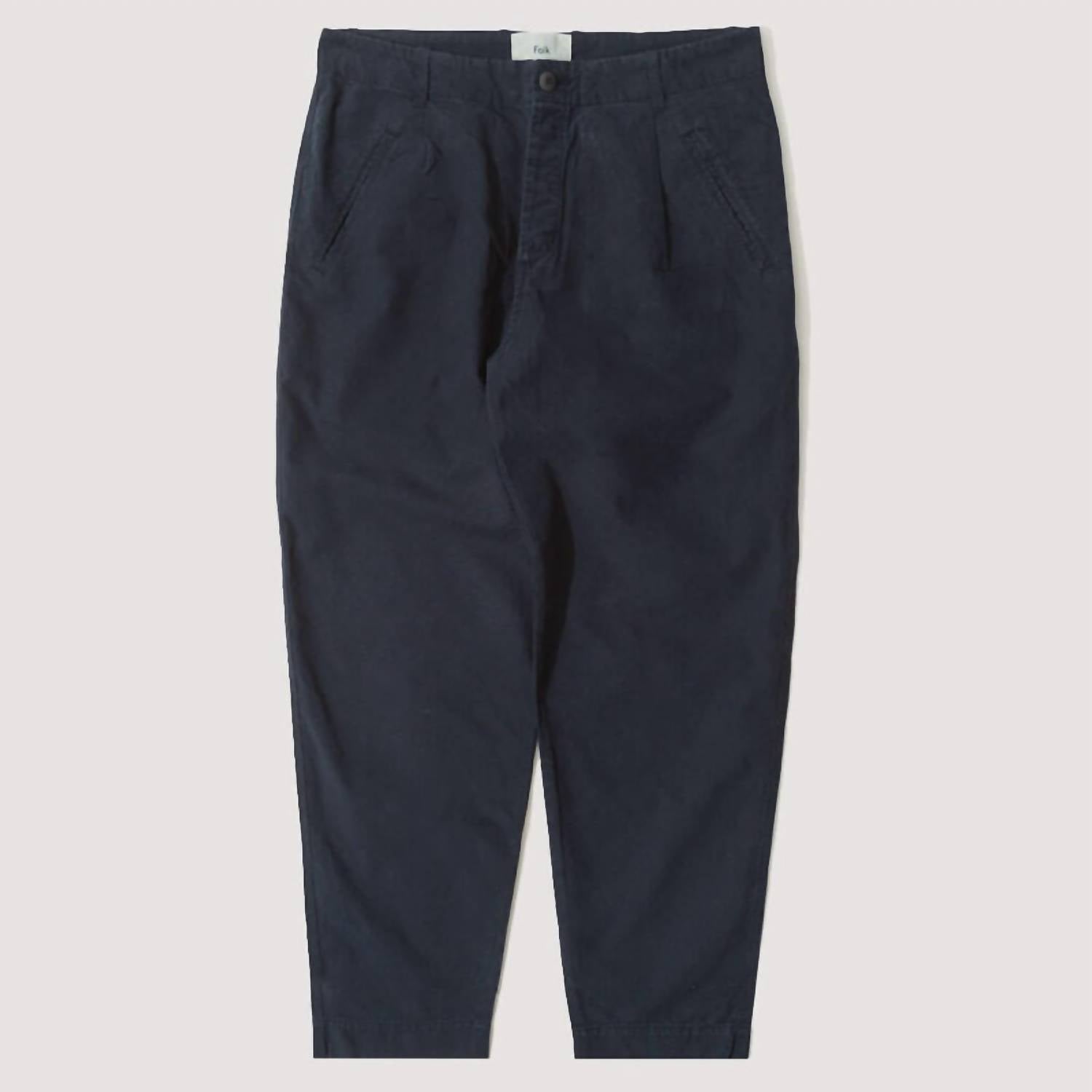 Introducing the Assembly Straight Pants by Folk, a must-have for those seeking comfort and style in a solid navy hue. Crafted from 100% brushed cotton twill, these pants feature a relaxed fit with a slightly tapered, cropped leg, and a concealed button fly closure. Designed with functionality in mind, they offer angled twin jet pockets at the front and straight welt pockets at the back. Made in Turkey, these trousers are machine washable for easy care, making them perfect for fall vacations and activewear occasions.