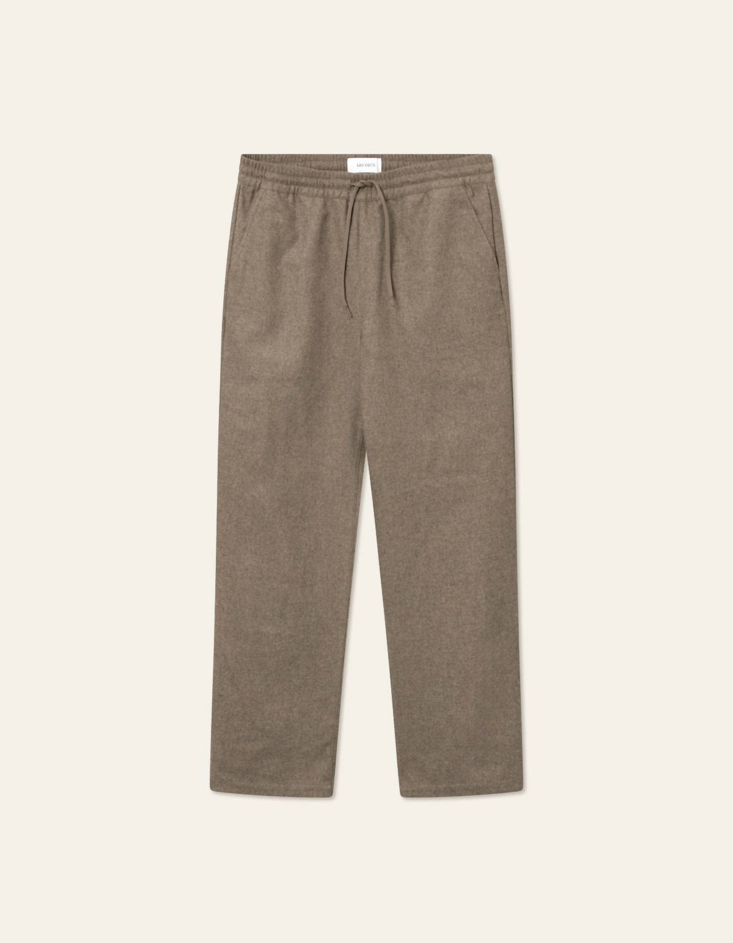 Introducing the Houston Wool Pants by Les Deux, perfect for a vacation with a minimalist flair in Desert Taupe. These relaxed fit pants feature a wide-leg style with a stretchy drawstring waist for ease of wear. Made from a 50% recycled polyester, 50% wool blend, these pants are machine washable and suitable for tumble drying. Designed in solid color, they include a silky inner lining, ensuring comfort and style in cooler fall weather.