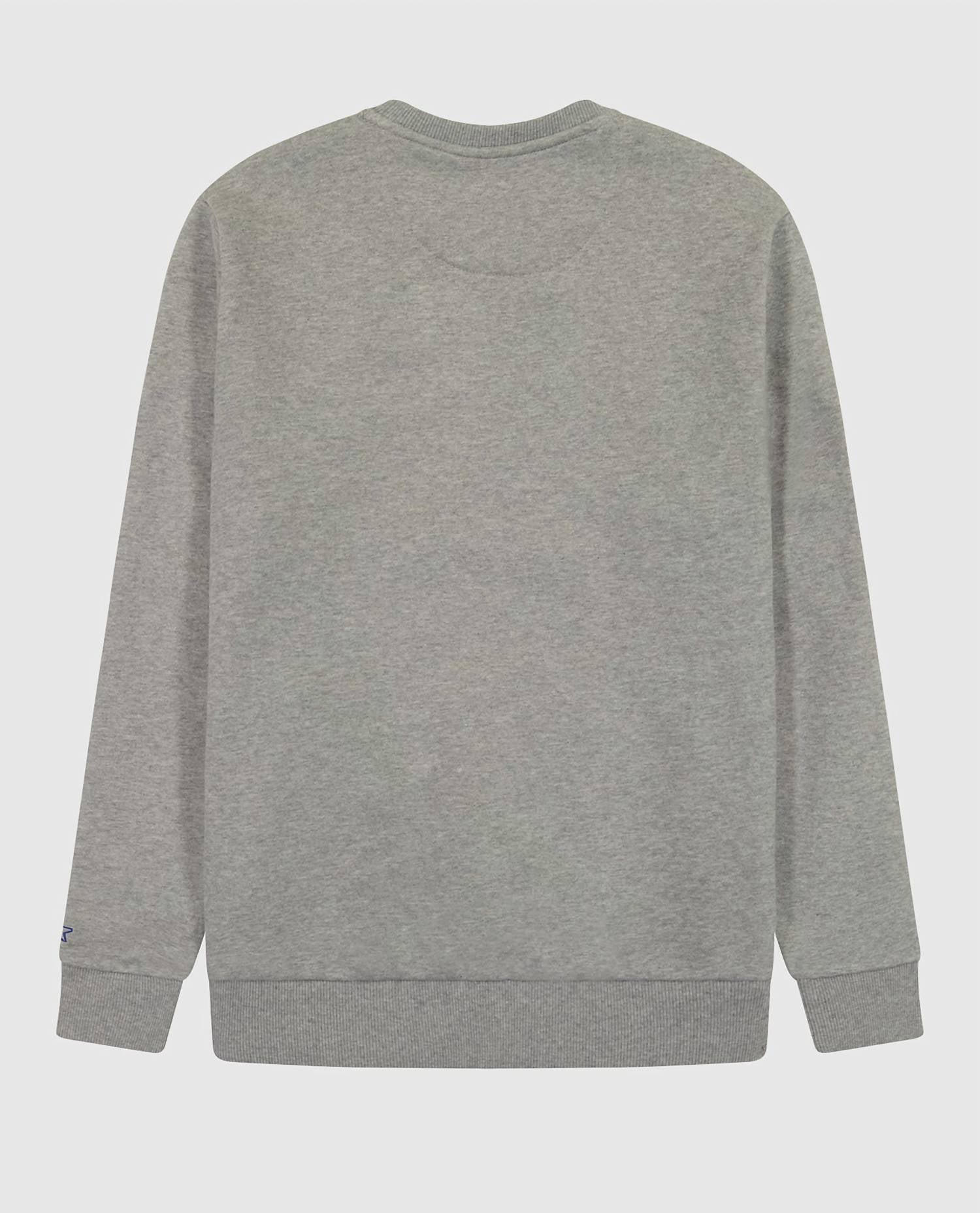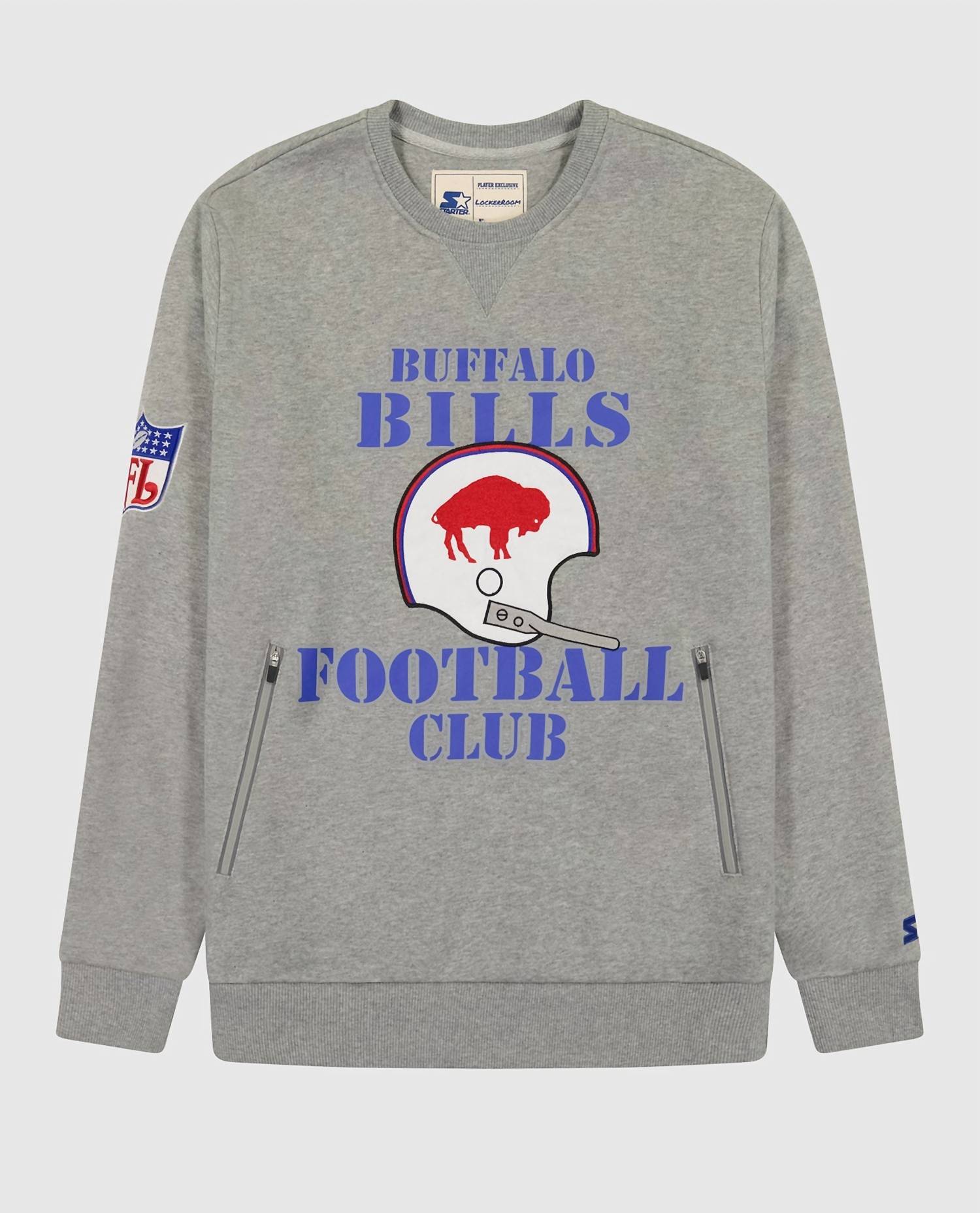 The Men's Buffalo Bills Crew Neck Sweatshirt by Starter combines style and functionality in a sleek heather grey design. With long sleeves and a pull-on closure, this sweatshirt features a fleece crew neck for added comfort. Highlighting your team pride, the graphic pattern showcases a screen-printed team name with city, a large team logo helmet applique, and a retro NFL shield twill applique patch on the right sleeve. Despite no specific care instructions, its durable construction ensures lasting wear.