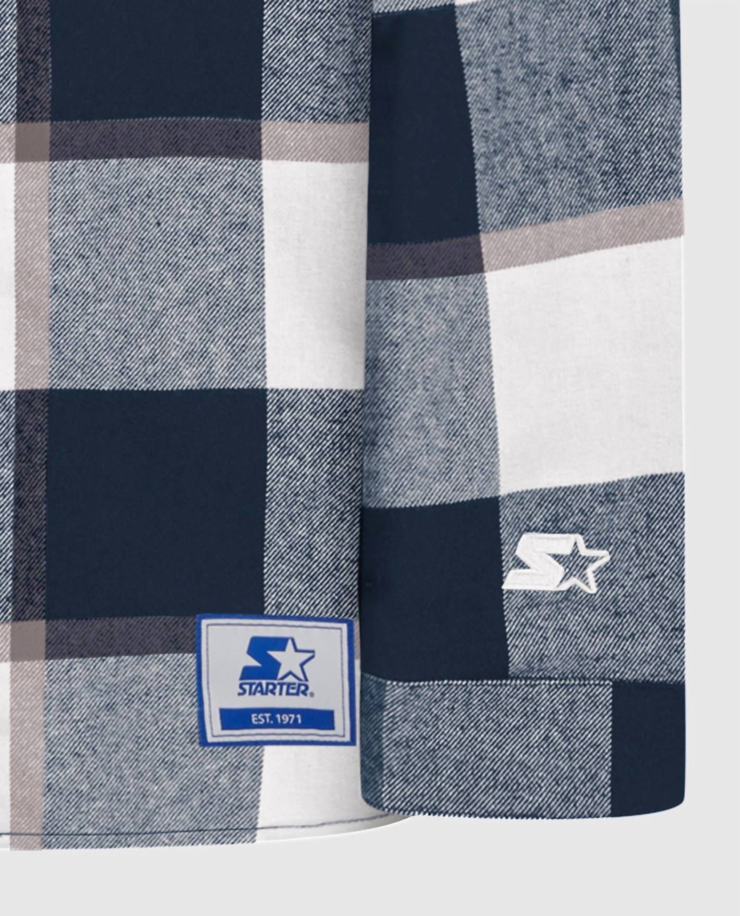 Stay warm and support your team with the Men's New England Patriots Sherpa Lined Plaid Starter Jacket by Starter. This navy jacket features a hooded neckline and long sleeves, perfect for cooler weather. The plaid & check pattern adds a stylish touch, complemented by button closure for easy wear. It's finished with team and brand logo embroidery, showcasing your loyalty in style. Pockets are included for added convenience.