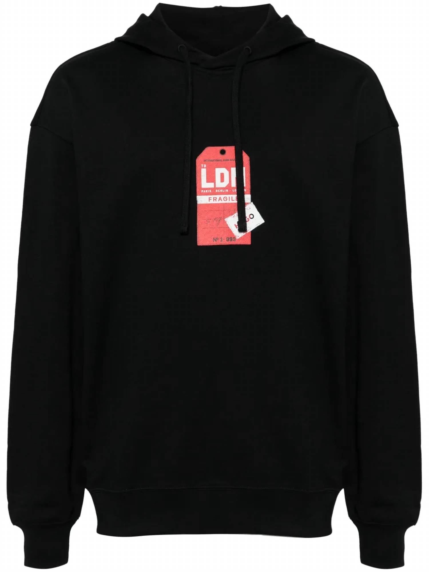Striking graphic prints in black and red. Designed with a drawstring hood, drop shoulders, and long sleeves. Combines comfort and fashion effortlessly. Made entirely from cotton. Promises cozy wear and features ribbed trims and a straight hem. Care is simple with machine wash instructions. Convenient pull-on style makes it easy to wear.