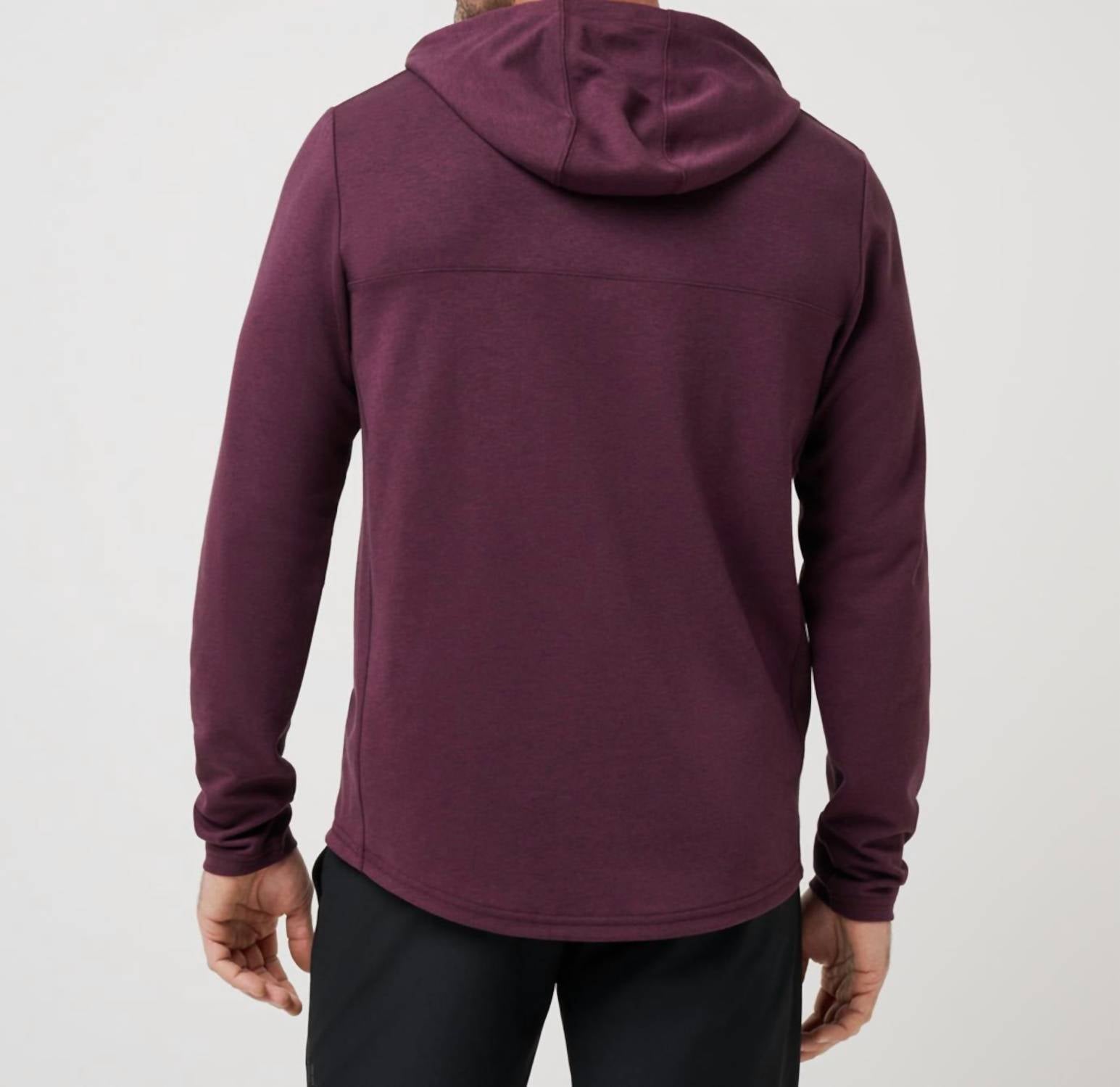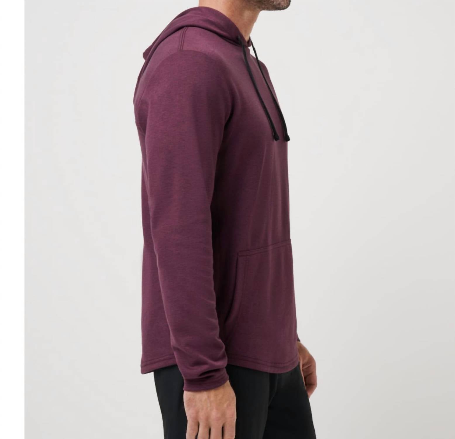 Experience the blend of style and function with the Upgraded Tech Hoodie by Travis Mathew, designed in a sophisticated Heather Mauve Wine. This men's hoodie features long sleeves and a hooded neckline, providing optimal comfort with its Polyester/Cotton blend fabric. The practical pull-on style is complemented by a curved hem and an external kangaroo pocket, adorned with the HD TravisMathew logo on the shoulder seam. Designed for versatility, it maintains a solid pattern ideal for both workouts and casual wear.