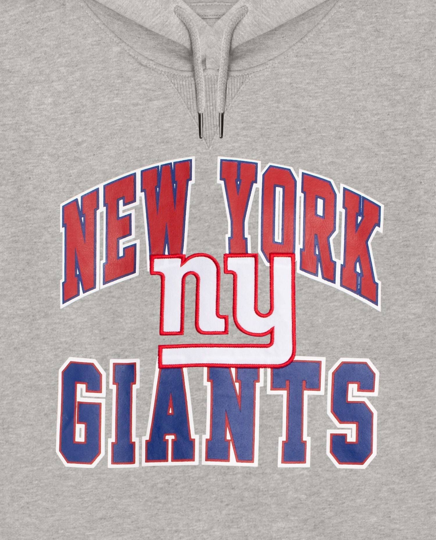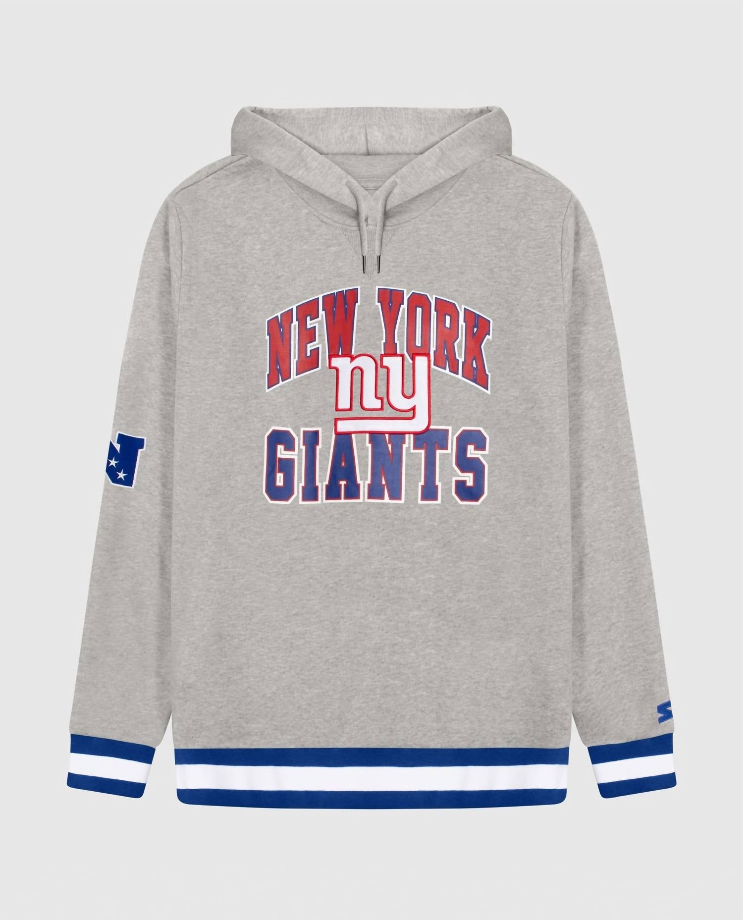 Introducing the Starter New York Giants Knit Hoodie Sweatshirt in a versatile heather grey. This men's pullover features long sleeves, a hooded neckline, and contrast striped rib knit cuffs and waistband in the team's primary colors. Adorned with a screen-printed team name at the center chest and a team logo applique, it is a must-have for any Giants fan. Closure is easy with a pull-on style, making it a comfortable choice for any casual outing.