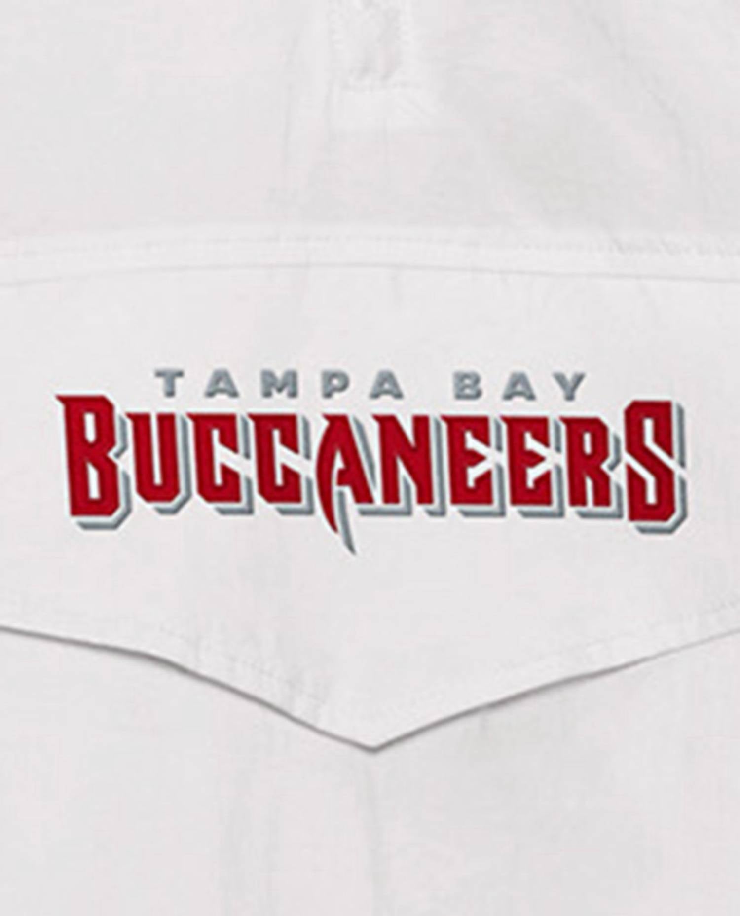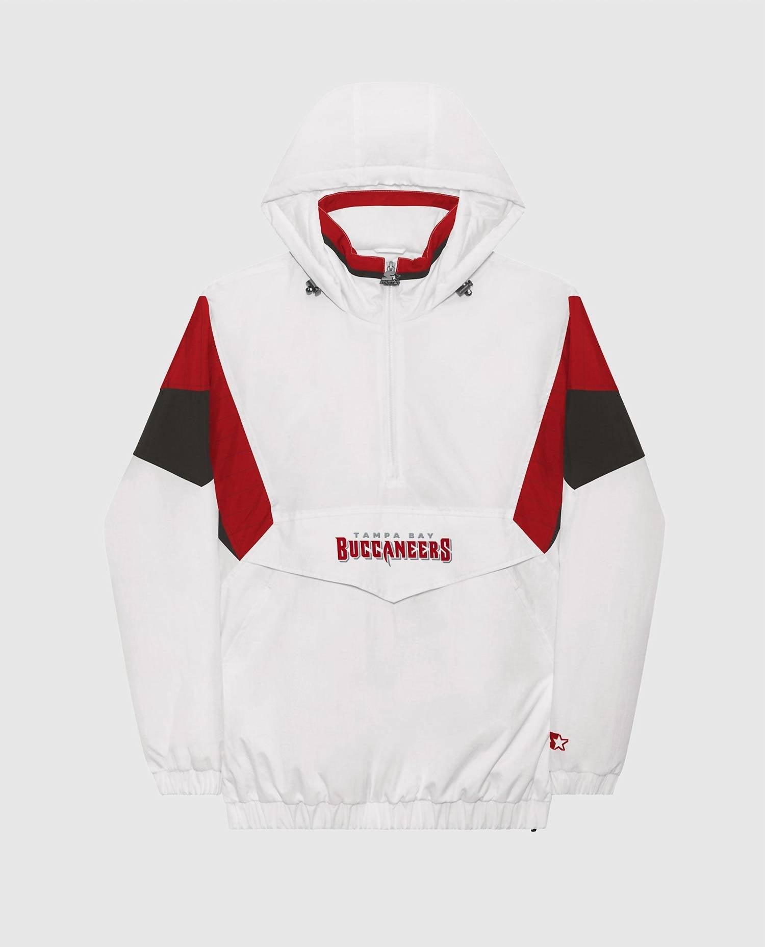Experience style and comfort with the Men's Tampa Bay Buccaneers The Breakaway Nylon Half-zip Jacket by Starter. This jacket features long sleeves and a practical zip closure, making it a versatile addition to your wardrobe. Adorned with contrast team color stripes and a twill applique team wordmark, its standout design is completed by a hooded neckline and convenient front pocket. Crafted in a graphic pattern, this white jacket is perfect for showcasing team spirit.